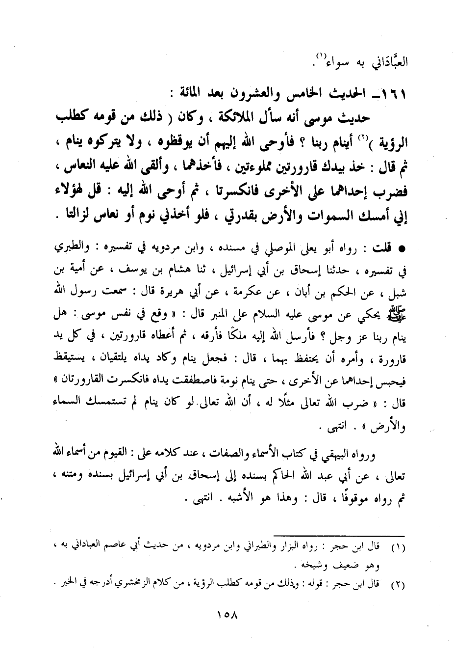 قلت رَوَاهُ أَبُو يعْلى الْموصِلِي فِي مُسْنده وَابْن مرْدَوَيْه فِي تَفْسِيره والطبري فِي تَفْسِيره حَدثنَا إِسْحَاق بن أبي إِسْرَائِيل ثَنَا هِشَام بن يُوسُف عَن أُميَّة بن شبْل عَن الحكم بن أبان عَن عِكْرِمَة عَن أبي هُرَيْرَة قَالَ سَمِعت رَسُول الله صَلَّى اللَّهُ عَلَيْهِ وَسَلَّم َ يَحْكِي عَن مُوسَى عَلَيْهِ السَّلَام عَلَى الْمِنْبَر قَالَ وَقع فِي نَفْس مُوسَى هَل ينَام رَبنَا عَزَّ وَجَلَّ فَأرْسل الله إِلَيْهِ ملكا فَأَرقهُ ثمَّ أعطَاهُ قَارُورَتَيْنِ فِي كل يَد قَارُورَة وَأمره أَن يحْتَفظ بهما قَالَ فَجعل ينَام وَكَاد يَدَاهُ يَلْتَقِيَانِ يَسْتَيْقِظ فَيحْبس إِحْدَاهمَا عَن الْأُخْرَى حَتَّى ينَام نومَة فَاصْطَفَقَتْ يَدَاهُ فَانْكَسَرت الْقَارُورَتَانِ قَالَ ضرب الله تَعَالَى مثلا لَهُ أَن الله تَعَالَى لَو كَانَ ينَام لم تسْتَمْسك السَّمَاء وَالْأَرْض انْتَهَى