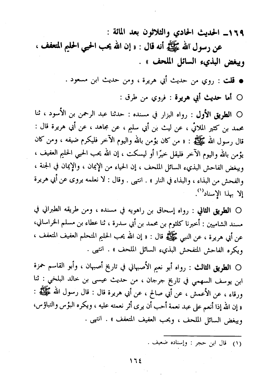 الطَّرِيق الثَّانِي رَوَاهُ إِسْحَاق بن رَاهَوَيْه فِي مُسْنده وَمن طَرِيقه الطَّبَرَانِيّ فِي مُسْند الشاميين أخبرنَا كُلْثُوم بن مُحَمَّد بن أبي سِدْرَة ثَنَا عَطاء بن مُسلم الْخُرَاسَانِي عَن أبي هُرَيْرَة عَن النَّبِي صَلَّى اللَّهُ عَلَيْهِ وَسَلَّم َ قَالَ إِن الله يحب الْحَلِيم المتحلم الْعَفِيف الْمُتَعَفِّف وَيكرهُ الْفَاحِش الْمُتَفَحِّش الْبَذِيء السَّائِل الْمُلْحِف انْتَهَى