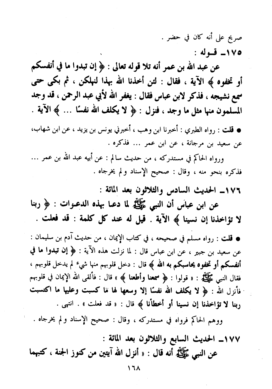 عَن عبد الله بن عمر أَنه تَلا قَوْله تَعَالَى إِن تبدوا مَا فِي أَنفسكُم أَو تُخْفُوهُ الْآيَة فَقَالَ لَئِن أَخذنَا الله بِهَذَا لَنهْلكَنَّ ثمَّ بَكَى حَتَّى سمع نَشِيجه فَذكر لِابْنِ عَبَّاس فَقَالَ يغْفر الله لأبي عبد الرَّحْمَن قد وجد الْمُسلمُونَ مِنْهَا مثل مَا وجد فَنزل لَا يُكَلف الله نفسا ... الْآيَة