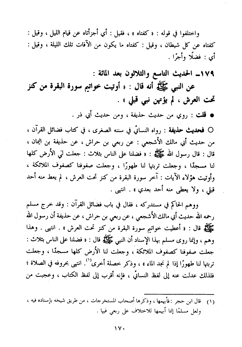 فَحَدِيث حُذَيْفَة رَوَاهُ النَّسَائِيّ فِي سنَنه الصُّغْرَى فِي كتاب فَضَائِل الْقُرْآن من حَدِيث أبي مَالك الْأَشْجَعِيّ عَن ربعي بن حِرَاش عَن حُذَيْفَة بن الْيَمَان قَالَ قَالَ رَسُول الله صَلَّى اللَّهُ عَلَيْهِ وَسَلَّم َ فضلنَا عَلَى النَّاس بِثَلَاث جعلت لي الأَرْض كلهَا لنا مَسْجِدا وَجعلت تربَتهَا لنا طهُورا وَجعلت صُفُوفنَا كَصُفُوف الْمَلَائِكَة وَأُوتِيت هَؤُلَاءِ الْآيَات آخر سُورَة الْبَقَرَة من كنز تَحت الْعَرْش لم يُعْط مِنْهُ أحد قبلي وَلَا يُعْطَى مِنْهُ أحد بعدِي انْتَهَى
