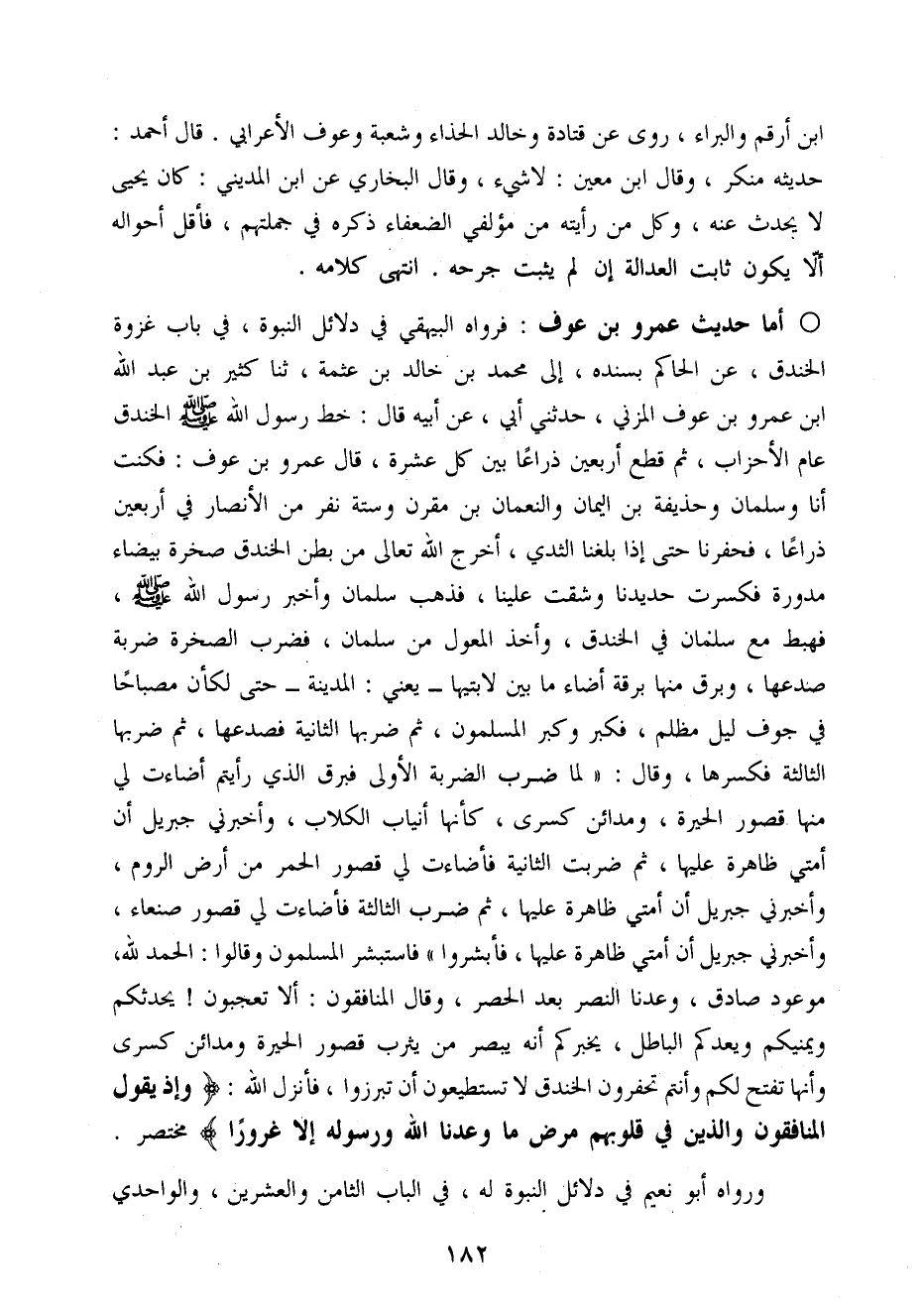 أما حَدِيث عَمْرو بن عَوْف فَرَوَاهُ الْبَيْهَقِيّ فِي دَلَائِل النُّبُوَّة فِي بَاب غَزْوَة الخَنْدَق عَن الْحَاكِم بِسَنَدِهِ إِلَى مُحَمَّد بن خَالِد بن عَثْمَة ثَنَا كثير بن عبد الله ابْن عَمْرو بن عَوْف الْمُزنِيّ حَدثنِي أبي عَن أَبِيه قَالَ خطّ رَسُول الله صَلَّى اللَّهُ عَلَيْهِ وَسَلَّم َ الخَنْدَق عَام الْأَحْزَاب ثمَّ قطع أَرْبَعِينَ ذِرَاعا بَين كل عشرَة قَالَ عَمْرو بن عَوْف فَكنت أَنا وسلمان وَحُذَيْفَة بن الْيَمَان والنعمان بن مقرن وَسِتَّة نفر من الْأَنْصَار فِي أَرْبَعِينَ ذِرَاعا فَحَفَرْنَا حَتَّى إِذا بلغنَا الثدي أخرج الله تَعَالَى من بطن الخَنْدَق صَخْرَة بَيْضَاء مُدَوَّرَة فَكسرت حَدِيدَنَا وَشقت علينا فَذهب سلمَان وَاخْبَرْ رَسُول الله صَلَّى اللَّهُ عَلَيْهِ وَسَلَّم َ فهبط مَعَ سلمَان فِي الخَنْدَق وَأخذ الْمعول من سلمَان فَضرب الصَّخْرَة ضَرْبَة صَدعهَا وبرق مِنْهَا برقة أَضَاء مَا بَين لابتيها يَعْنِي الْمَدِينَة حَتَّى لكأن مصباحا فِي جَوف ليل مظلم فَكبر وَكبر الْمُسلمُونَ ثمَّ ضربهَا الثَّانِيَة فَصَدَعَهَا ثمَّ ضربهَا الثَّالِثَة فَكَسرهَا وَقَالَ لما ضرب الضَّرْبَة الأولَى فَبَرَق الَّذِي رَأَيْتُمْ أَضَاءَت لي مِنْهَا قُصُور الْحيرَة وَمَدَائِن كسْرَى كَأَنَّهَا أَنْيَاب الْكلاب وَأَخْبرنِي جِبْرِيل أَن أمتِي ظَاهِرَة عَلَيْهَا ثمَّ ضربت الثَّانِيَة فَأَضَاءَتْ لي قُصُور الْحمر من أَرض الرّوم وَأَخْبرنِي جِبْرِيل أَن أمتِي ظَاهِرَة عَلَيْهَا ثمَّ ضرب الثَّالِثَة فَأَضَاءَتْ لي قُصُور صنعاء وَأَخْبرنِي جِبْرِيل أَن أمتِي ظَاهِرَة عَلَيْهَا فأبشروا فَاسْتَبْشَرَ الْمُسلمُونَ وَقَالُوا الْحَمد لله مَوْعُود صَادِق وعدنا النَّصْر بعد الْحصْر وَقَالَ المُنَافِقُونَ أَلا تعْجبُونَ يُحَدثكُمْ وَيُمَنِّيكُمْ وَيَعدكُمْ الْبَاطِل يُخْبِركُمْ أَنه يبصر من يثرب قُصُور الْحيرَة وَمَدَائِن كسْرَى وَأَنَّهَا تفتح لكم وَأَنْتُم تَحْفِرُونَ الخَنْدَق لَا تَسْتَطِيعُونَ أَن تبْرزُوا فَأنْزل الله وَإِذ يَقُول المُنَافِقُونَ وَالَّذين فِي قُلُوبهم مرض مَا وعدنا الله وَرَسُوله إِلَّا غرُورًا مُخْتَصر