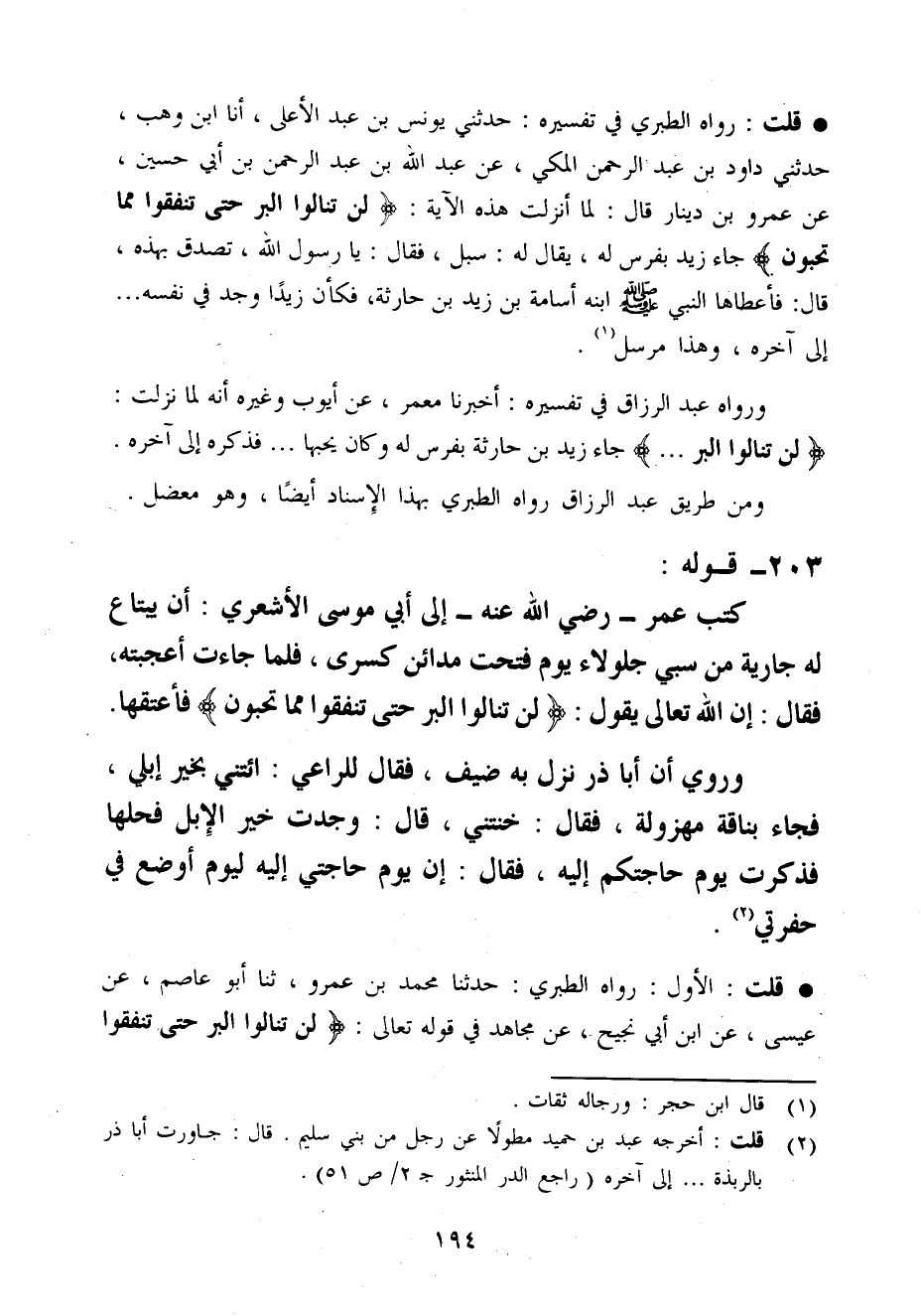 قلت الأول رَوَاهُ الطَّبَرِيّ حَدثنَا مُحَمَّد بن عَمْرو ثَنَا أَبُو عَاصِم عَن عِيسَى عَن ابْن أبي نجيح عَن مُجَاهِد فِي قَوْله تَعَالَى لن تنالوا الْبر حَتَّى تنفقوا