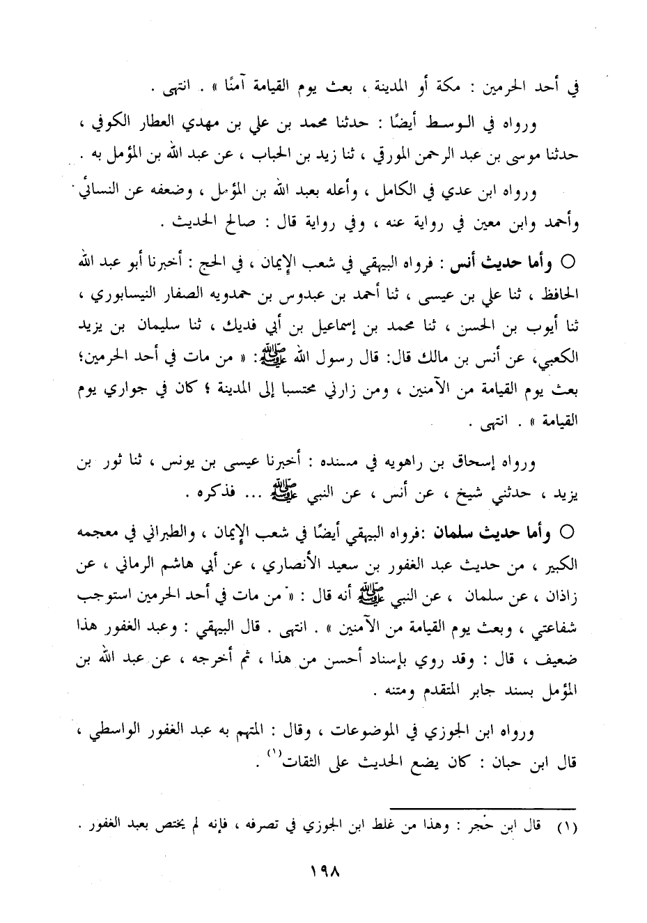 وَأما حَدِيث سلمَان فَرَوَاهُ الْبَيْهَقِيّ أَيْضا فِي شعب الْإِيمَان وَالطَّبَرَانِيّ فِي مُعْجَمه الْكَبِير من حَدِيث عبد الغفور بن سعيد الْأنْصَارِيّ عَن أبي هَاشم الرماني عَن زَاذَان عَن سلمَان عَن النَّبِي صَلَّى اللَّهُ عَلَيْهِ وَسَلَّم َ أَنه قَالَ من مَاتَ فِي أحد الْحَرَمَيْنِ اسْتوْجبَ شَفَاعَتِي وَبعث يَوْم الْقِيَامَة من الْآمنينَ انْتَهَى قَالَ الْبَيْهَقِيّ وَعبد الغفور هَذَا ضَعِيف قَالَ وَقد رُوِيَ بِإِسْنَاد أحسن من هَذَا ثمَّ أخرجه عَن عبد الله بن المؤمل بِسَنَد جَابر الْمُتَقَدّم وَمَتنه