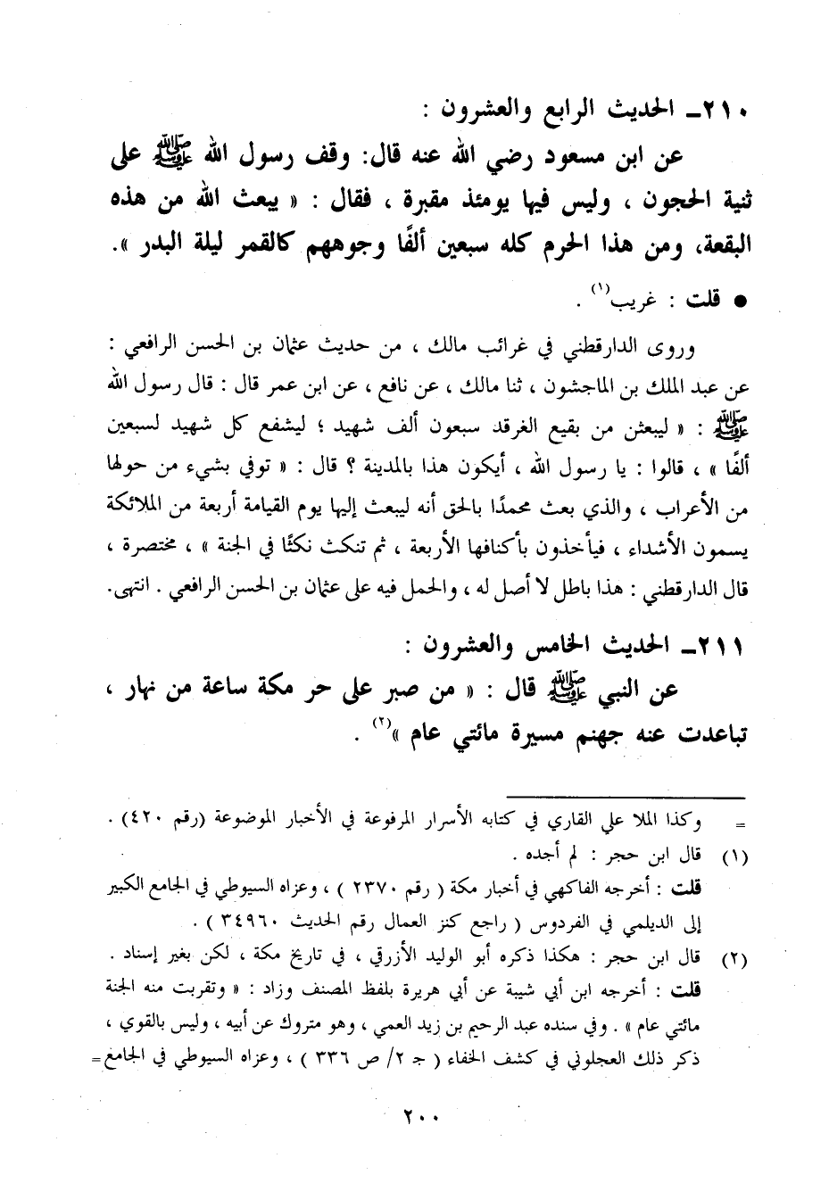 عَن النَّبِي صَلَّى اللَّهُ عَلَيْهِ وَسَلَّم َ قَالَ من صَبر عَلَى حر مَكَّة سَاعَة من نَهَار تَبَاعَدت عَنهُ جَهَنَّم مسيرَة مِائَتي عَام