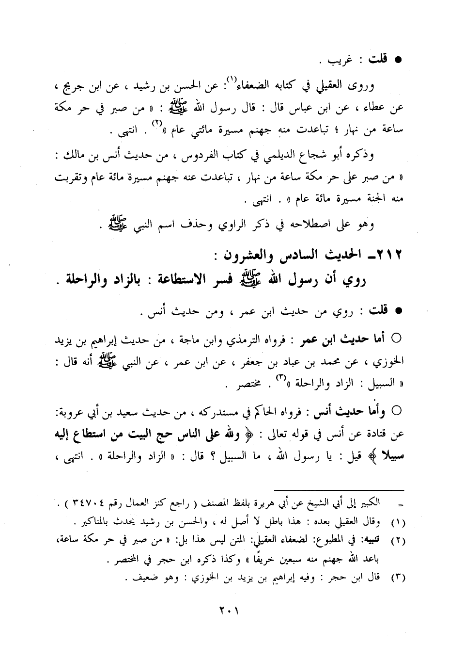 وَرَوَى الْعقيلِيّ فِي كِتَابه الضُّعَفَاء عَن الْحسن بن رشيد عَن ابْن جريج عَن عَطاء عَن ابْن عَبَّاس قَالَ قَالَ رَسُول الله صَلَّى اللَّهُ عَلَيْهِ وَسَلَّم َ من صَبر فِي حر مَكَّة سَاعَة من نَهَار تَبَاعَدت مِنْهُ جَهَنَّم مسيرَة مِائَتي عَام انْتَهَى