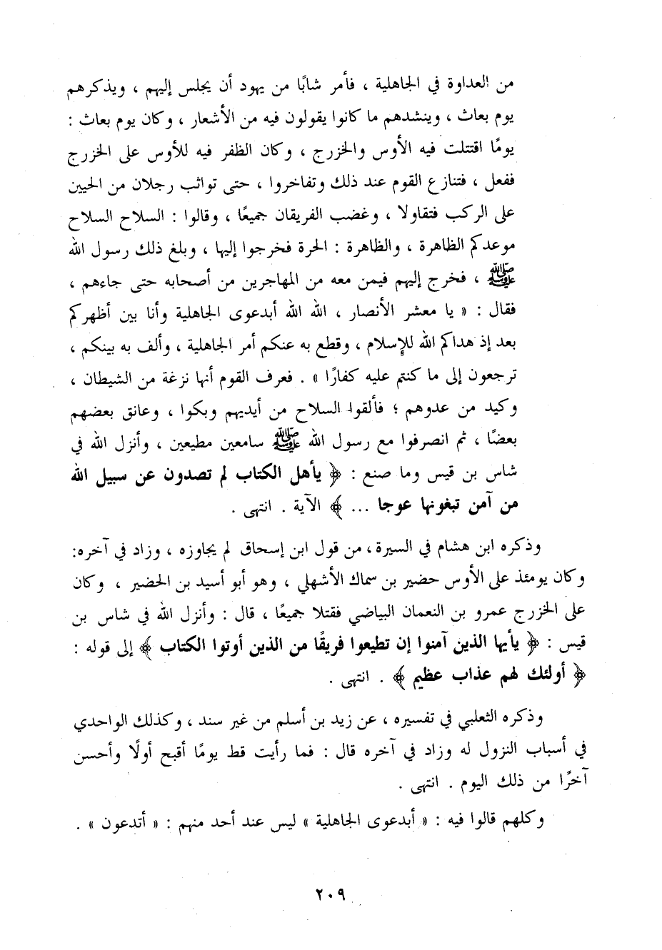 من الْعَدَاوَة فِي الْجَاهِلِيَّة فَأمر شَابًّا من يهود أَن يجلس إِلَيْهِم وَيذكرهُمْ يَوْم بُعَاث وينشدهم مَا كَانُوا يَقُولُونَ فِيهِ من الْأَشْعَار وَكَانَ يَوْم بُعَاث يَوْمًا اقْتتلَتْ فِيهِ الْأَوْس والخزرج وَكَانَ الظفر فِيهِ لِلْأَوْسِ عَلَى الْخَزْرَج فَفعل فَتَنَازَعَ الْقَوْم عِنْد ذَلِك وَتَفَاخَرُوا حَتَّى توَاثب رجلَانِ من الْحَيَّيْنِ عَلَى الركب فَتَقَاوَلَا وَغَضب الْفَرِيقَانِ جَمِيعًا وَقَالُوا السِّلَاح السِّلَاح مَوْعدكُمْ الظَّاهِرَة وَالظَّاهِرَة الْحرَّة فَخَرجُوا إِلَيْهَا وَبلغ ذَلِك رَسُول الله صَلَّى اللَّهُ عَلَيْهِ وَسَلَّم َ فَخرج إِلَيْهِم فِيمَن مَعَه من الْمُهَاجِرين من أَصْحَابه حَتَّى جَاءَهُم فَقَالَ يَا معشر الْأَنْصَار الله الله أَبِدَعْوَى الْجَاهِلِيَّة وَأَنا بَين أظْهركُم بعد إِذْ هدَاكُمْ الله لِلْإِسْلَامِ وَقطع بِهِ عَنْكُم أَمر الْجَاهِلِيَّة وَألف بِهِ بَيْنكُم ترجعون إِلَى مَا كُنْتُم عَلَيْهِ كفَّارًا فَعرف الْقَوْم أَنَّهَا نَزعَة من الشَّيْطَان وَكيد من عدوهم فَألْقوا السِّلَاح من أَيْديهم وَبكوا وَعَانَقَ بَعضهم بَعْضًا ثمَّ انصرفوا مَعَ رَسُول الله صَلَّى اللَّهُ عَلَيْهِ وَسَلَّم َ سَامِعين مُطِيعِينَ وَأنزل الله فِي شَاس بن قيس وَمَا صنع يأهل الْكتاب لم تصدُّونَ عَن سَبِيل الله من آمن تَبْغُونَهَا عوجا ... الْآيَة انْتَهَى