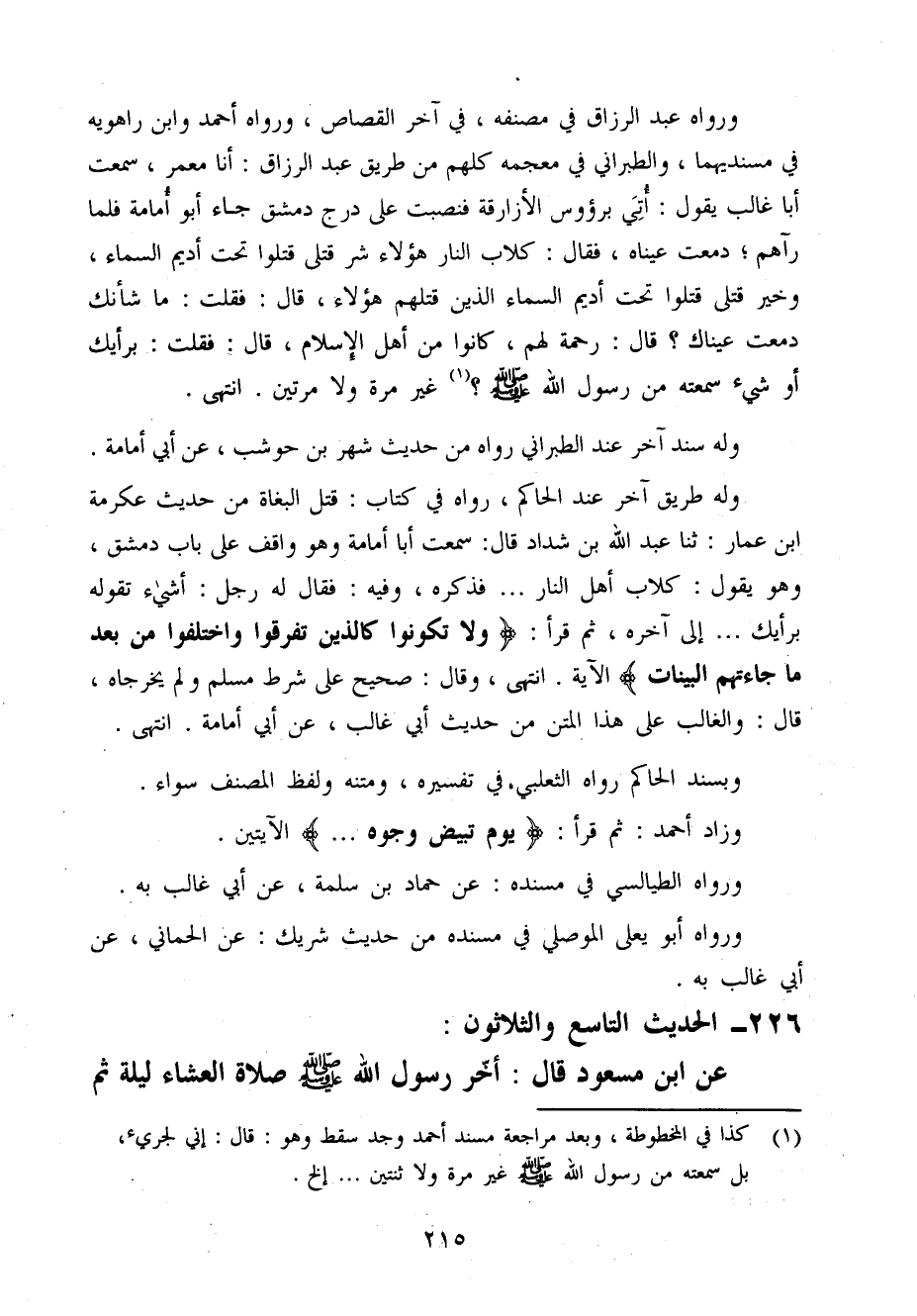 وَرَوَاهُ عبد الرَّزَّاق فِي مُصَنفه فِي آخر الْقصاص وَرَوَاهُ أَحْمد وَابْن رَاهَوَيْه فِي مسنديهما وَالطَّبَرَانِيّ فِي مُعْجَمه كلهم من طَرِيق عبد الرَّزَّاق أَنا معمر سَمِعت أَبَا غَالب يَقُول أُتِي برؤوس الْأزَارِقَة فَنصبت عَلَى درج دمشق جَاءَ أَبُو أُمَامَة فَلَمَّا رَآهُمْ دَمَعَتْ عَيناهُ فَقَالَ كلاب النَّار هَؤُلَاءِ شَرّ قَتْلَى قتلوا تَحت أَدِيم السَّمَاء وَخير قَتْلَى قتلوا تَحت أَدِيم السَّمَاء الَّذين قَتلهمْ هَؤُلَاءِ قَالَ فَقلت مَا شَأْنك دَمَعَتْ عَيْنَاك قَالَ رَحْمَة لَهُم كَانُوا من أهل الْإِسْلَام قَالَ فَقلت بِرَأْيِك أَو شَيْء سمعته من رَسُول الله صَلَّى اللَّهُ عَلَيْهِ وَسَلَّم َ غير مرّة وَلَا مرَّتَيْنِ انْتَهَى