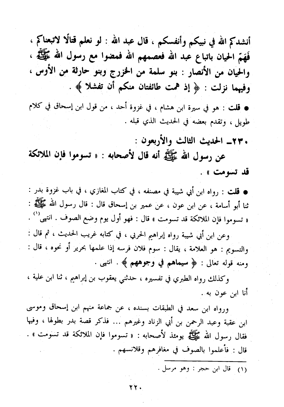 وَرَوَاهُ ابْن سعد فِي الطَّبَقَات بِسَنَدِهِ عَن جمَاعَة مِنْهُم ابْن إِسْحَاق ومُوسَى ابْن عقبَة وَعبد الرَّحْمَن بن أبي الزِّنَاد وَغَيرهم ... فَذكر قصَّة بدر بِطُولِهَا وفيهَا فَقَالَ رَسُول الله صَلَّى اللَّهُ عَلَيْهِ وَسَلَّم َ يَوْمئِذٍ لأَصْحَابه تسوموا فَإِن الْمَلَائِكَة قد تسومت قَالَ فأعلموا بالصوف فِي مغافرهم وَقَلَانِسِهِمْ