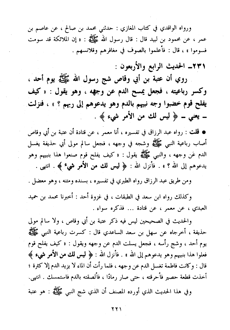 والْحَدِيث فِي الصَّحِيحَيْنِ لَيْسَ فِيهِ ذكر عتبَة بن أبي وَقاص وَلَا سَالم مولَى حُذَيْفَة أَخْرجَاهُ عَن سهل بن سعد السَّاعِدِيّ قَالَ كسرت ربَاعِية النَّبِي صَلَّى اللَّهُ عَلَيْهِ وَسَلَّم َ يَوْم أحد وشج رَأسه فَجعل يَسْلت الدَّم عَن وَجهه وَيَقُول كَيفَ يفلح قوم فعلوا هَذَا بِنَبِيِّهِمْ وَهُوَ يَدعُوهُم إِلَى الله فَأنْزل الله لَيْسَ لَك من الْأَمر شَيْء قَالَ وَكَانَت فَاطِمَة تغسل الدَّم عَن وَجهه فَلَمَّا رَأَتْ أَن المَاء لَا يزِيد الدَّم إِلَّا كَثْرَة أخذت قِطْعَة حَصِير فَأَحْرَقتهُ حَتَّى صَار رَمَادا فَأَلْصَقته بِالدَّمِ فَاسْتَمْسك انْتَهَى