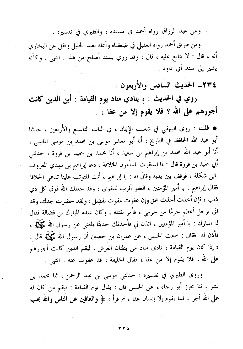 قلت رُوِيَ الْبَيْهَقِيّ فِي شعب الْإِيمَان فِي الْبَاب التَّاسِع وَالْأَرْبَعِينَ حَدثنَا أَبُو عبد الله الْحَافِظ فِي التَّارِيخ أَنا أَبُو معشر مُوسَى بن مُحَمَّد بن مُوسَى الْمَالِينِي أَنا أَبُو عبد الله مُحَمَّد بن إِبْرَاهِيم بن سعيد أَنا مُحَمَّد بن حميد بن فَرْوَة حَدثنِي أبي حميد بن فَرْوَة قَالَ لما اسْتَقَرَّتْ لِلْمَأْمُونِ الْخلَافَة دَعَا إِبْرَاهِيم بن مهْدي الْمَعْرُوف بِابْن شكْلَة فَوقف بَين يَدَيْهِ وَقَالَ لَهُ يَا إِبْرَاهِيم أَنْت المتوثب علينا تَدعِي الْخلَافَة فَقَالَ إِبْرَاهِيم يَا أَمِير الْمُؤمنِينَ الْعَفو أقرب للتَّقْوَى وَقد جعلك الله فَوق كل ذِي ذَنْب فَإِن أخذت أخذت بِحَق وَإِن عَفَوْت عَفَوْت بِفضل وَلَقَد حضرت جدك وَقد أُتِي بِرَجُل أعظم جرما من جُرْمِي فَأمر بقتْله وَكَانَ عِنْده الْمُبَارك بن فضَالة فَقَالَ لَهُ الْمُبَارك يَا أَمِير الْمُؤمنِينَ ائْذَنْ لي فأحدثك حَدِيثا بَلغنِي عَن رَسُول الله صَلَّى اللَّهُ عَلَيْهِ وَسَلَّم َ فَأذن لَهُ فَقَالَ سَمِعت الْحسن عَن عمرَان بن حُصَيْن أَن رَسُول الله صَلَّى اللَّهُ عَلَيْهِ وَسَلَّم َ قَالَ إِذا كَانَ يَوْم الْقِيَامَة نَادَى مُنَاد من بطْنَان الْعَرْش ليقمْ الَّذين كَانَت أُجُورهم عَلَى الله فَلَا يقوم إِلَّا من عَفا فَقَالَ الْخَلِيفَة قد عَفَوْت عَنهُ انْتَهَى
