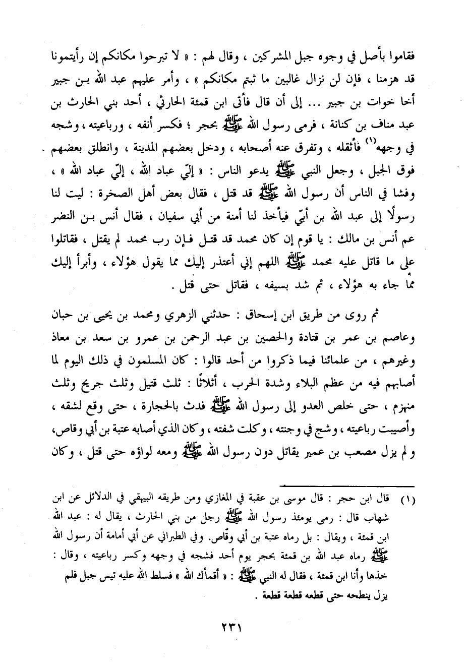 فَقَامُوا بِأَصْل فِي وُجُوه جبل الْمُشْركين وَقَالَ لَهُم لَا تَبْرَحُوا مَكَانكُمْ إِن رَأَيْتُمُونَا قد هَزَمْنَا فَإِن لن نزال غَالِبين مَا ثبتمْ مَكَانكُمْ وَأمر عَلَيْهِم عبد الله بن جُبَير أَخا خَوات بن جُبَير ... إِلَيّ أَن قَالَ فَأَتَى ابْن قمئة الْحَارِثِيّ أحد بني الْحَارِث بن عبد منَاف بن كنَانَة فَرَمَى رَسُول الله صَلَّى اللَّهُ عَلَيْهِ وَسَلَّم َ بِحجر فَكسر أَنفه وَرَبَاعِيَته وَشَجه فِي وَجهه فَأَثْقَله وتفرق عَنهُ أَصْحَابه وَدخل بَعضهم الْمَدِينَة وَانْطَلق بَعضهم فَوق الْجَبَل وَجعل النَّبِي صَلَّى اللَّهُ عَلَيْهِ وَسَلَّم َ يَدْعُو النَّاس إِلَى عباد الله إِلَيّ عباد الله وَفَشَا فِي النَّاس أَن رَسُول الله صَلَّى اللَّهُ عَلَيْهِ وَسَلَّم َ قد قتل فَقَالَ بعض أهل الصَّخْرَة لَيْت لنا رَسُولا إِلَى عبد الله بن أبي فَيَأْخُذ لنا أَمنه من أبي سُفْيَان فَقَالَ أنس بن النَّضر عَم أنس بن مَالك يَا قوم إِن كَانَ مُحَمَّد قد قتل فَإِن رب مُحَمَّد لم يقتل فَقَاتلُوا عَلَى مَا قَاتل عَلَيْهِ مُحَمَّد صَلَّى اللَّهُ عَلَيْهِ وَسَلَّم َ اللَّهُمَّ إِنِّي أعْتَذر إِلَيْك مِمَّا يَقُول هَؤُلَاءِ وَأَبْرَأ إِلَيْك مِمَّا جَاءَ بِهِ هَؤُلَاءِ ثمَّ شدّ بِسَيْفِهِ فقاتل حَتَّى قتل