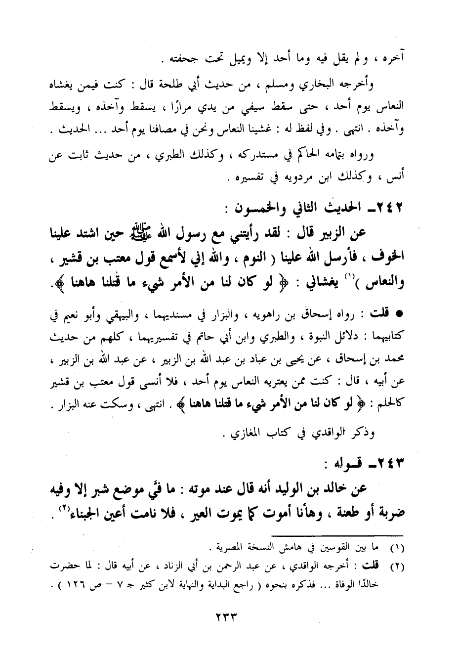 242 - الحَدِيث الثَّانِي وَالْخَمْسُونَ عَن الزُّبَيْر قَالَ لقد رَأَيْتنِي مَعَ رَسُول الله صَلَّى اللَّهُ عَلَيْهِ وَسَلَّم َ حِين اشْتَدَّ علينا الْخَوْف فَأرْسل الله علينا النّوم وَالله إِنِّي لأسْمع قَول مُتْعب بن قُشَيْر وَالنُّعَاس يَغْشَانِي لَو كَانَ لنا من الْأَمر شَيْء مَا قتلنَا هَاهُنَا