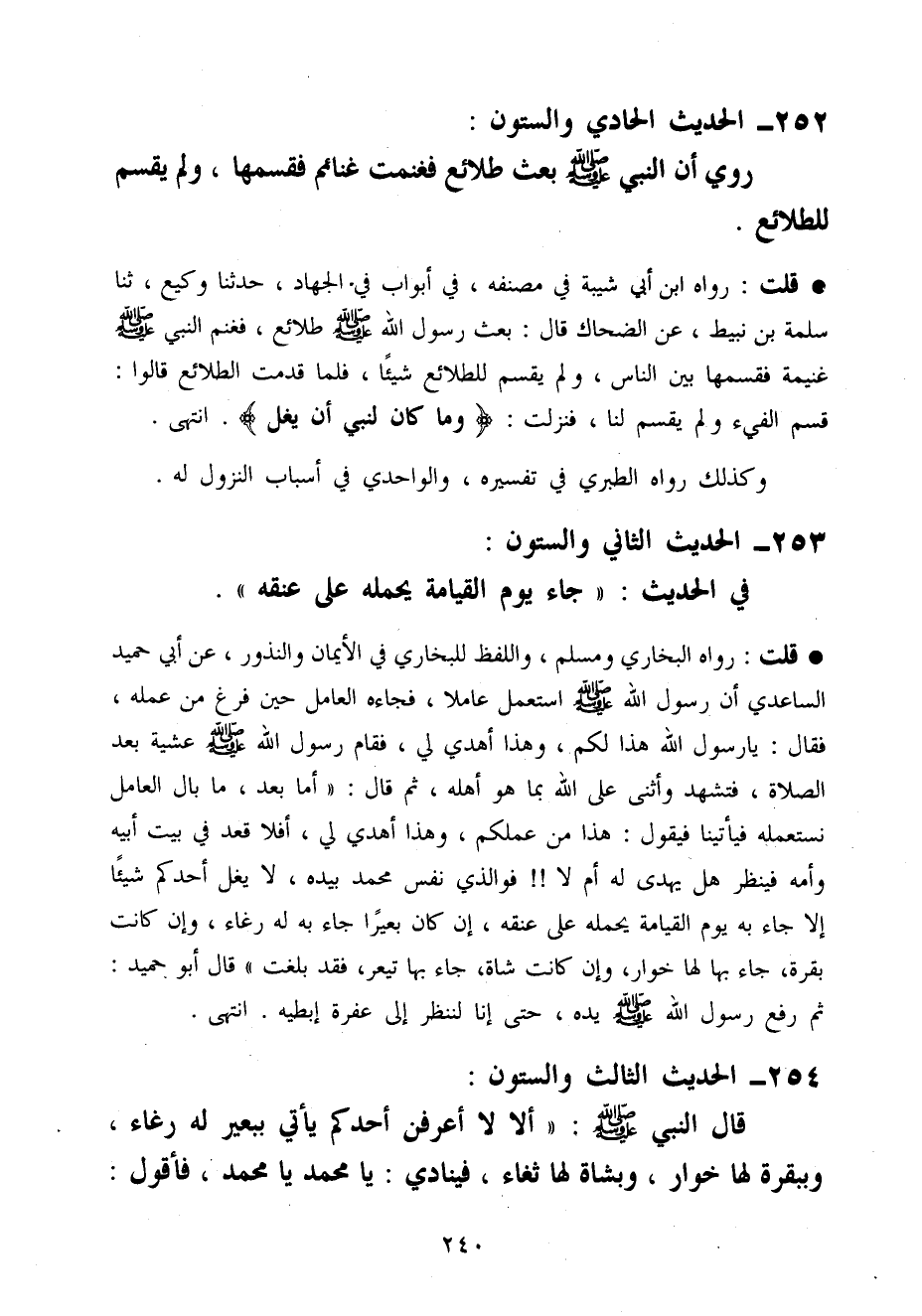 قلت رَوَاهُ البُخَارِيّ وَمُسلم وَاللَّفْظ للْبُخَارِيّ فِي الْأَيْمَان وَالنُّذُور عَن أبي حميد السَّاعِدِيّ أَن رَسُول الله صَلَّى اللَّهُ عَلَيْهِ وَسَلَّم َ اسْتعْمل عَاملا فَجَاءَهُ الْعَامِل حِين فرغ من عمله فَقَالَ يَا رَسُول الله هَذَا لكم وَهَذَا أهدي لي فَقَامَ رَسُول الله صَلَّى اللَّهُ عَلَيْهِ وَسَلَّم َ عَشِيَّة بعد الصَّلَاة فَتشهد وَأَثْنَى عَلَى الله بِمَا هُوَ أَهله ثمَّ قَالَ أما بعد مَا بَال الْعَامِل نَسْتَعْمِلهُ فَيَأْتِينَا فَيَقُول هَذَا من عَمَلكُمْ وَهَذَا أهدي لي أَفلا قعد فِي بَيت أَبِيه وَأمه فَينْظر هَل يُهْدَى لَهُ أم لَا فوالذي نَفْس مُحَمَّد بِيَدِهِ لَا يغل أحدكُم شَيْئا إِلَّا جَاءَ بِهِ يَوْم الْقِيَامَة يحملهُ عَلَى عُنُقه إِن كَانَ بَعِيرًا جَاءَ بِهِ لَهُ رُغَاء وَإِن كَانَت بقرة جَاءَ بهَا لَهَا خوار وَإِن كَانَت شَاة جَاءَ بهَا تَيْعر فقد بلغت قَالَ أَبُو حميد ثمَّ رفع رَسُول الله صَلَّى اللَّهُ عَلَيْهِ وَسَلَّم َ يَده حَتَّى إِنَّا لنَنْظُر إِلَى عفرَة إبطَيْهِ انْتَهَى