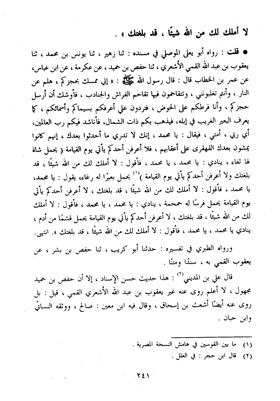 قلت رَوَاهُ أَبُو يعْلى الْموصِلِي فِي مُسْنده ثَنَا زُهَيْر ثَنَا يُونُس بن مُحَمَّد ثَنَا يَعْقُوب بن عبد الله القمي الْأَشْعَرِيّ ثَنَا حَفْص بن حميد عَن عِكْرِمَة عَن ابْن عَبَّاس عَن عمر بن الْخطاب قَالَ قَالَ رَسُول الله صَلَّى اللَّهُ عَلَيْهِ وَسَلَّم َ إِنِّي مُمْسك بِحُجزِكُمْ هَلُمَّ عَن النَّار وَأَنْتُم تغلبونني وتتقاحمون فِيهَا تَقَاحم الْفراش وَالْجَنَادِب فَأوشك أَن أرسل حُجُزكُمْ وَأَنا فَرَطكُمْ عَلَى الْحَوْض فَتَردونَ عَلّي أعرفكُم بِسِيمَاكُمْ وَأَسْمَائِكُمْ كَمَا يعرف الْبَعِير الْغَرِيب فِي إبِله فَيذْهب بكم ذَات الشمَال فَأُنَاشِد فِيكُم رب الْعَالمين أَي رَبِّي أمتِي فَيُقَال يَا مُحَمَّد إِنَّك لَا تَدْرِي مَا أَحْدَثُوا بعْدك إِنَّهُم كَانُوا يَمْشُونَ بعْدك الْقَهْقَرَى عَلَى أَعْقَابهم فَلَا أَعرفن أحدكُم يَأْتِي يَوْم الْقِيَامَة يحمل شَاة لَهَا ثُغَاء يُنَادي يَا مُحَمَّد يَا مُحَمَّد فَأَقُول لَا أملك لَك من الله شَيْئا قد بلغتك وَلَا أَعرفن أحدكُم يَأْتِي يَوْم الْقِيَامَة يحمل بَعِيرًا لَهُ رُغَاء يَقُول يَا مُحَمَّد يَا مُحَمَّد فَأَقُول لَا أملك لَك من الله شَيْئا قد بلغتك لَا أَعرفن أحدكُم يَأْتِي يَوْم الْقِيَامَة يحمل فرسا لَهُ حَمْحَمَة يُنَادي يَا مُحَمَّد يَا مُحَمَّد فَأَقُول لَا أملك لَك من الله شَيْئا قد بلغتك لَا أَعرفن أحدكُم يَأْتِي يَوْم الْقِيَامَة يحمل قشما من أَدَم يُنَادي يَا مُحَمَّد يَا مُحَمَّد فَأَقُول لَا أملك لَك من الله شَيْئا قد بلغتك انْتَهَى