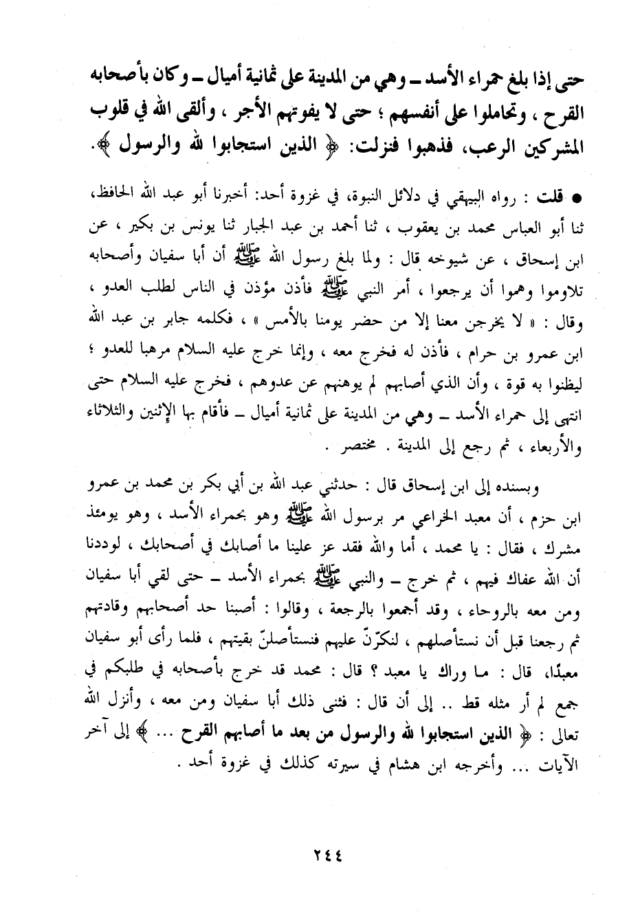 قلت رَوَاهُ الْبَيْهَقِيّ فِي دَلَائِل النُّبُوَّة فِي غَزْو أحد أخبرنَا أَبُو عبد عبد الله الْحَافِظ ثَنَا أَبُو الْعَبَّاس مُحَمَّد بن يَعْقُوب ثَنَا أَحْمد بن عبد الْجَبَّار ثَنَا يُونُس بن بكير عَن ابْن إِسْحَاق عَن شُيُوخه قَالَ وَلما بلغ رَسُول الله صَلَّى اللَّهُ عَلَيْهِ وَسَلَّم َ أَن أَبَا سُفْيَان وَأَصْحَابه تَلَاوَمُوا وهموا أَن يرجِعوا أَمر النَّبِي صَلَّى اللَّهُ عَلَيْهِ وَسَلَّم َ فَأذن مُؤذن فِي النَّاس لطلب الْعَدو وَقَالَ لَا يخْرجن مَعنا إِلَّا من حضر يَوْمنَا بالْأَمْس فَكَلمهُ جَابر بن عبد الله ابْن عَمْرو بن حرَام فَأذن لَهُ فَخرج مَعَه وَإِنَّمَا خرج صَلَّى اللَّهُ عَلَيْهِ وَسَلَّم َ مُرْهِبًا لِلْعَدو لِيَظُنُّوا بِهِ قُوَّة وَا، الَّذِي أَصَابَهُم لم يُوهِنهُمْ عَن عدوهم فَخرج صَلَّى اللَّهُ عَلَيْهِ وَسَلَّم َ حَتَّى انْتَهَى إِلَى حَمْرَاء الْأسد وَهِي من الْمَدِينَة عَلَى ثَمَانِيَة أَمْيَال فَأَقَامَ بهَا الِاثْنَيْنِ وَالثُّلَاثَاء وَالْأَرْبِعَاء ثمَّ رَجَعَ إِلَى الْمَدِينَة مُخْتَصر