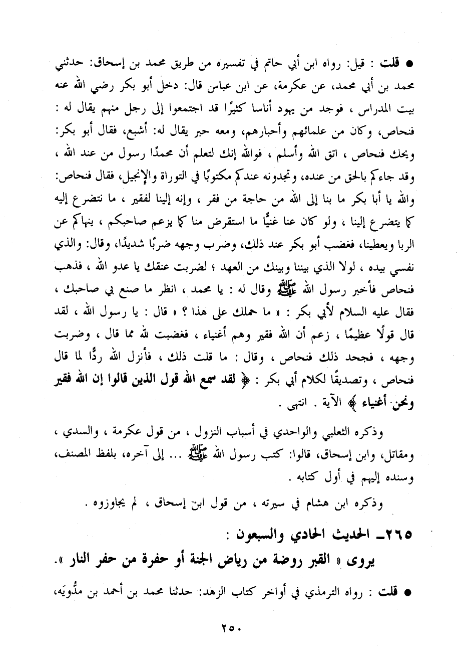 قلت قيل رَوَاهُ ابْن أبي حَاتِم فِي تَفْسِيره من طَرِيق مُحَمَّد بن إِسْحَاق حَدثنِي مُحَمَّد بن أبي مُحَمَّد عَن عِكْرِمَة عَن ابْن عَبَّاس قَالَ دخل أَبُو بكر رَضِيَ اللَّهُ عَنْه بَيت الْمدَارِس فَوجدَ من يهود أُنَاسًا كثيرا قد اجْتَمعُوا إِلَى رجل مِنْهُم يُقَال لَهُ فنحَاص وَكَانَ من عُلَمَائهمْ وَأَحْبَارهمْ وَمَعَهُ حبر يُقَال لَهُ أشْبع فَقَالَ أَبُو بكر وَيحك فنحَاص اتَّقِ الله وَأسلم فوَاللَّه إِنَّك لتعلم أَن مُحَمَّدًا رَسُول من عِنْد الله وَقد جَاءَكُم بِالْحَقِّ من عِنْده وَتَجِدُونَهُ عنْدكُمْ مَكْتُوبًا فِي التَّوْرَاة وَالْإِنْجِيل فَقَالَ فنحَاص وَالله يَا أَبَا بكر مَا بِنَا إِلَى الله من حَاجَة من فقر وَإنَّهُ إِلَيْنَا الْفَقِير مَا نَتَضَرَّع إِلَيْهِ كَمَا يتَضَرَّع إِلَيْنَا وَلَو كَانَ عَنَّا غَنِيا مَا اسْتقْرض منا كَمَا يزْعم صَاحبكُم يَنْهَاكُم عَن الرِّبَا وَيُعْطِينَا فَغَضب أَبُو بكر عِنْد ذَلِك وَضرب وَجهه ضربا شَدِيدا وَقَالَ وَالَّذِي نَفسِي بِيَدِهِ لَوْلَا الَّذِي بَيْننَا وَبَيْنك من الْعَهْد لضَرَبْت عُنُقك يَا عَدو الله فَذهب فنحَاص فَأخْبر رَسُول الله صَلَّى اللَّهُ عَلَيْهِ وَسَلَّم َ وَقَالَ لَهُ يَا مُحَمَّد انْظُر مَا صنع بِي صَاحبك فَقَالَ عَلَيْهِ السَّلَام لأبي بكر مَا حملك عَلَى هَذَا قَالَ يَا رَسُول الله لقد قَالَ قولا عَظِيما زعم أَن الله فَقير وهم أَغْنِيَاء فَغضِبت لله مِمَّا قَالَ وَضربت وَجهه فَجحد ذَلِك فنحَاص وَقَالَ مَا قلت ذَلِك فَأنْزل الله ردا لما قَالَ فنحَاص وَتَصْدِيقًا لكَلَام أبي بكر لقد سمع الله قَول الَّذين قَالُوا إِن الله فَقير وَنحن أَغْنِيَاء الْآيَة انْتَهَى