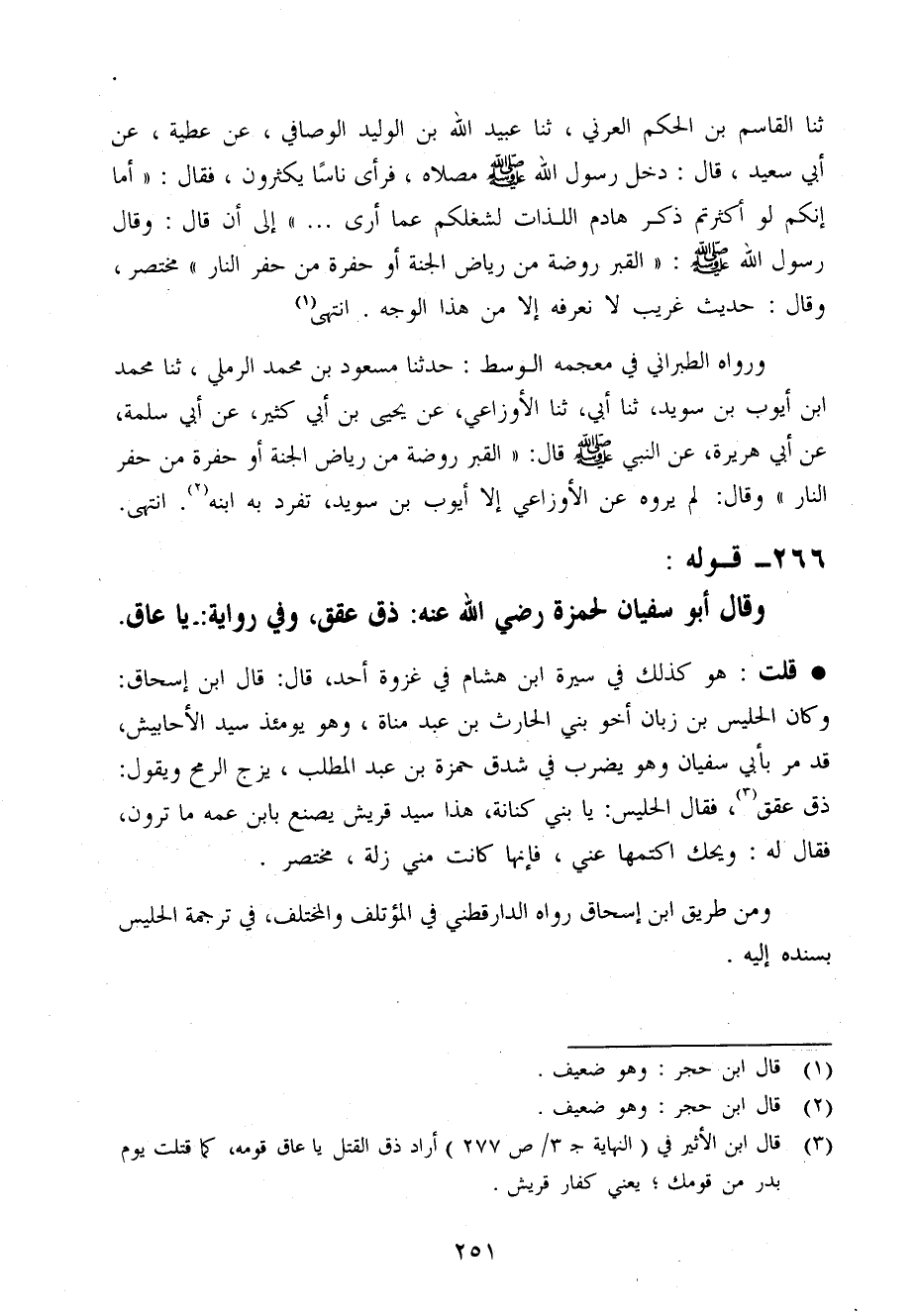 ثَنَا الْقَاسِم بن الحكم العرني ثَنَا عبيد الله بن الْوَلِيد الْوَصَّافِي عَن عَطِيَّة عَن أبي سعيد قَالَ دخل رَسُول الله صَلَّى اللَّهُ عَلَيْهِ وَسَلَّم َ مُصَلَّاهُ فَرَأَى نَاسا يكثرون فَقَالَ أما إِنَّكُم لَو أَكثرْتُم ذكر هَادِم اللَّذَّات لَشَغَلَكُمْ عَمَّا أرَى ... إِلَى أَن قَالَ وَقَالَ رَسُول الله صَلَّى اللَّهُ عَلَيْهِ وَسَلَّم َ الْقَبْر رَوْضَة من رياض الْجنَّة أَو حُفْرَة من حفر النَّار مُخْتَصر وَقَالَ حَدِيث غَرِيب لَا نعرفه إِلَّا من هَذَا الْوَجْه انْتَهَى