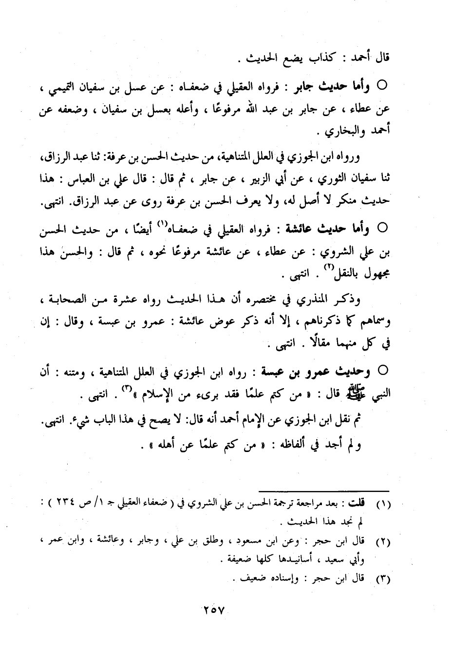 وَرَوَاهُ ابْن الْجَوْزِيّ فِي الْعِلَل المتناهية من حَدِيث الْحسن بن عَرَفَة ثَنَا عبد الرازق ثَنَا سُفْيَان الثَّوْريّ عَن أبي الزُّبَيْر عَن جَابر ثمَّ قَالَ قَالَ عَلّي بن الْعَبَّاس هَذَا حَدِيث مُنكر لَا أصل لَهُ وَلَا يعرف الْحسن بن عَرَفَة رَوَى عَن عبد الرازق انْتَهَى