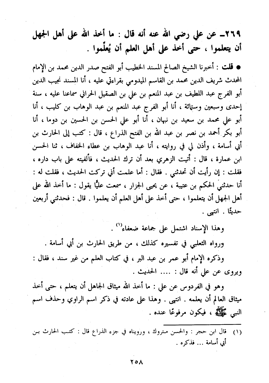 269 - عَن عَلّي رَضِيَ اللَّهُ عَنْه أَنه قَالَ مَا أَخذ الله عَلَى أهل الْجَهْل أَن يتعلموا حَتَّى أَخذ عَلَى أهل الْعلم أَن يعلمُوا