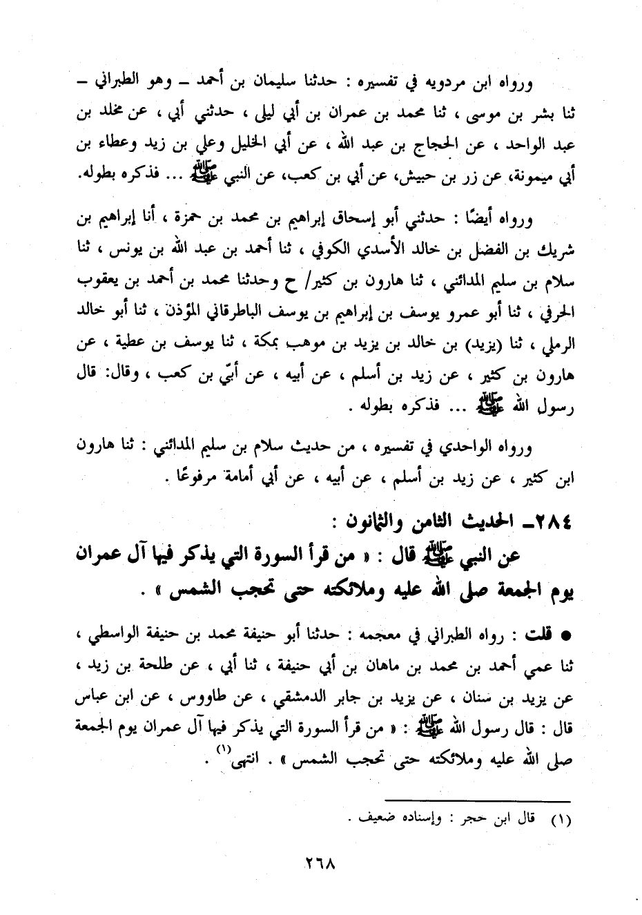 قلت رَوَاهُ الطَّبَرَانِيّ فِي مُعْجَمه حَدثنَا أَبُو حنيفَة مُحَمَّد بن حنيفَة الوَاسِطِيّ ثَنَا عمي أَحْمد بن مُحَمَّد بن ماهان بن أبي حنيفَة ثَنَا أبي عَن طَلْحَة بن زيد عَن يزِيد بن سِنَان عَن يزِيد بن جَابر الدِّمَشْقِي عَن طَاوُوس عَن ابْن عَبَّاس قَالَ قَالَ رَسُول الله صَلَّى اللَّهُ عَلَيْهِ وَسَلَّم َ من قَرَأَ السُّورَة الَّتِي يذكر فِيهَا آل عمرَان يَوْم الْجُمُعَة صَلَّى الله عَلَيْهِ وَمَلَائِكَته حَتَّى تحجب الشَّمْس انْتَهَى