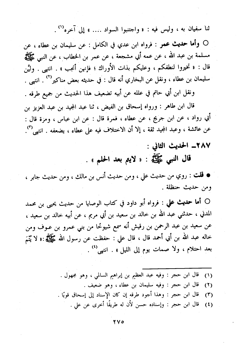 أما حَدِيث عَلّي فَرَوَاهُ أَبُو دَاوُد فِي كتاب الْوَصَايَا من حَدِيث يَحْيَى بن مُحَمَّد الْمدنِي حَدثنِي عبد الله بن خَالِد بن سعيد بن أبي مَرْيَم عَن أَبِيه خَالِد بن سعيد عَن سعيد بن عبد الرَّحْمَن بن رُقَيْش أَنه سمع شُيُوخًا من بني عَمْرو بن عَوْف وَمن خَاله عبد الله بن أبي أَحْمد قَالَ قَالَ عَلّي حفظت عَن رَسُول الله صَلَّى اللَّهُ عَلَيْهِ وَسَلَّم َ لَا يتم بعد احْتِلَام وَلَا صمَات يَوْم إِلَى اللَّيْل انْتَهَى