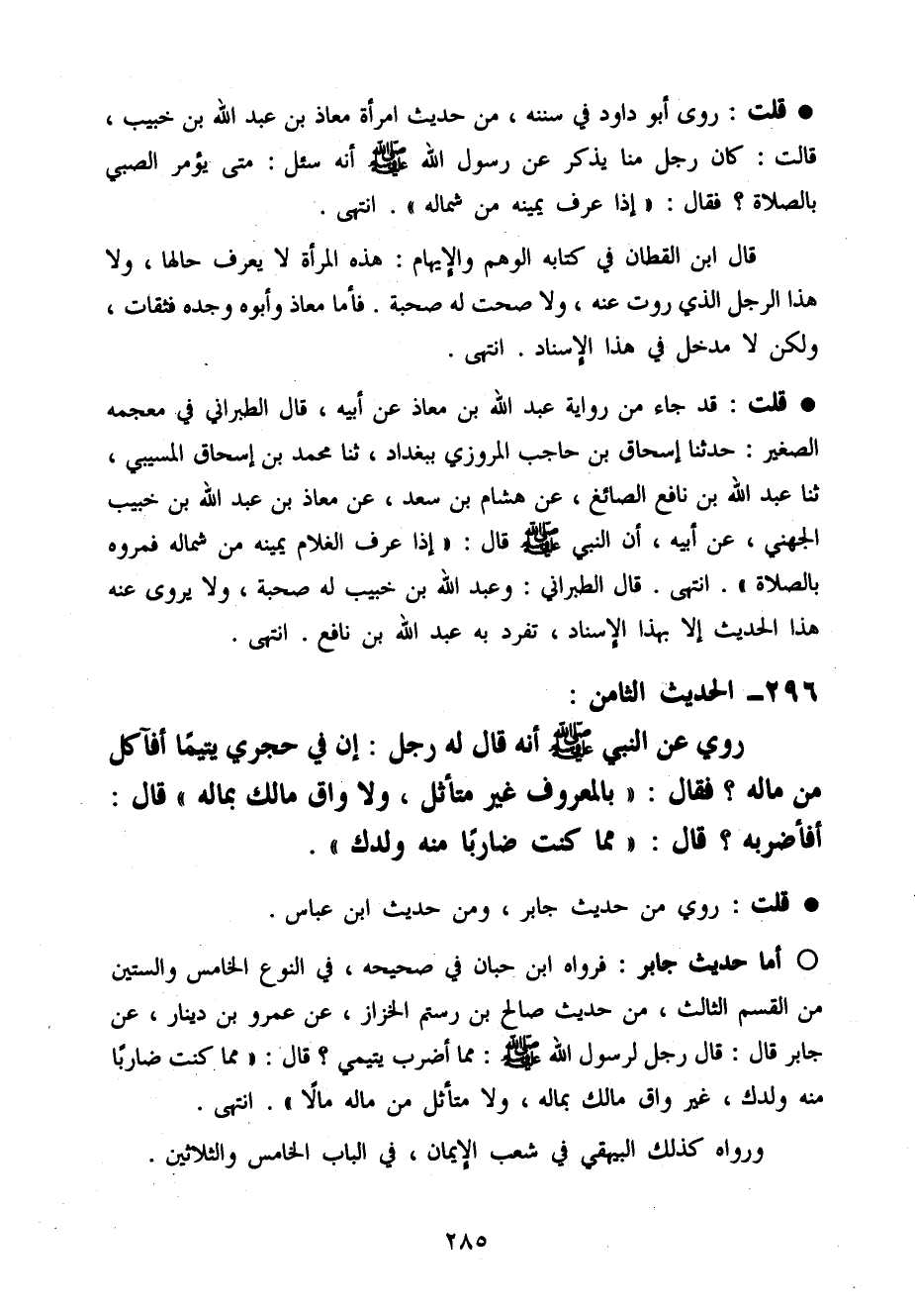 أما حَدِيث جَابر فَرَوَاهُ ابْن حبَان فِي صَحِيحه فِي النَّوْع الْخَامِس وَالسِّتِّينَ من الْقسم الثَّالِث من حَدِيث صَالح بن رستم الخزاز عَن عَمْرو بن دِينَار عَن جَابر قَالَ قَالَ رجل لرَسُول الله صَلَّى اللَّهُ عَلَيْهِ وَسَلَّم َ مِمَّا أضْرب يَتِيمِي قَالَ مِمَّا كنت ضَارِبًا مِنْهُ ولدك غير واق مَالك بِمَالِه وَلَا متأثل من مَاله مَالا انْتَهَى