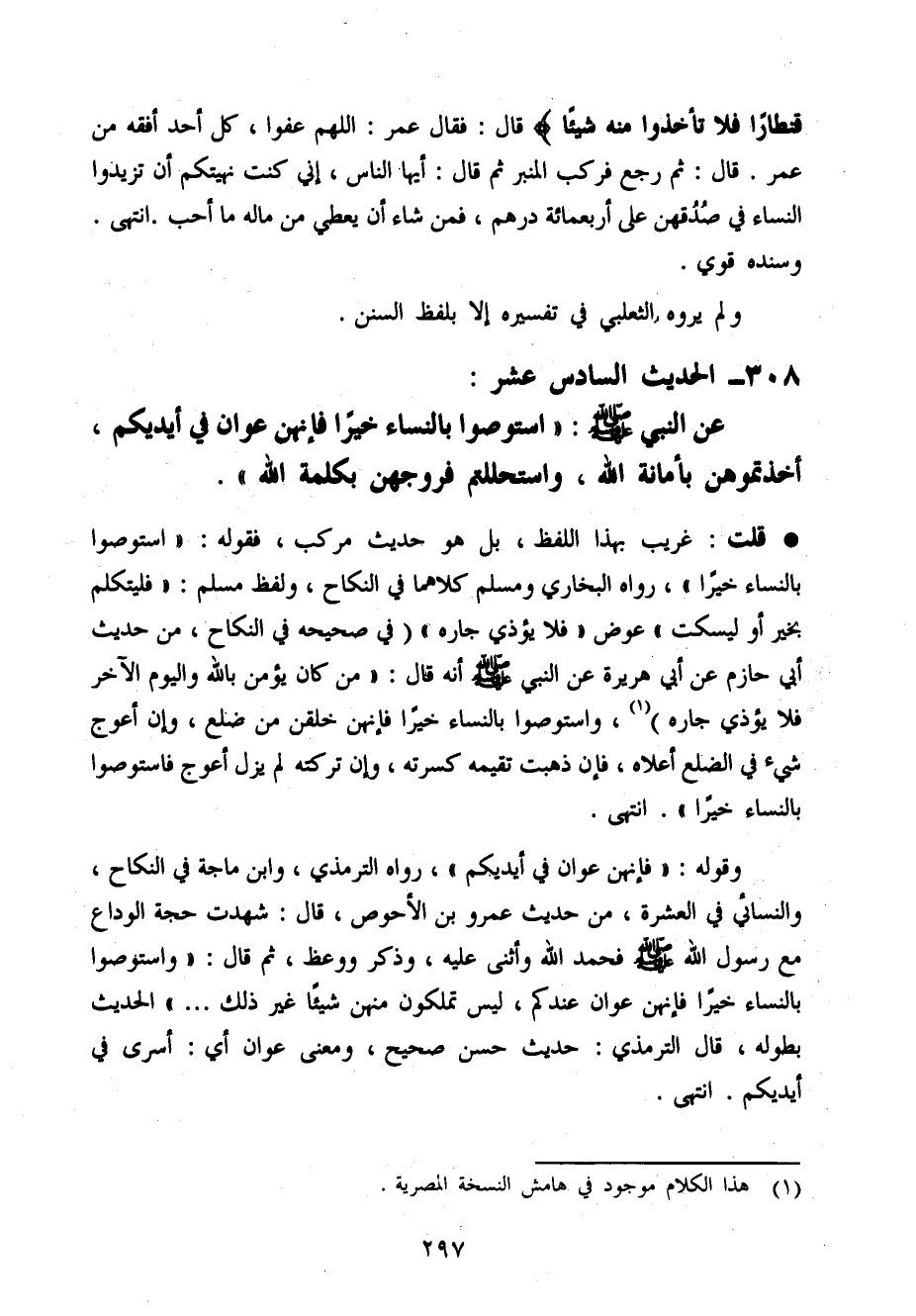 عَن النَّبِي صَلَّى اللَّهُ عَلَيْهِ وَسَلَّم َ اسْتَوْصُوا بِالنسَاء خيرا فَإِنَّهُنَّ عوان فِي أَيْدِيكُم أَخَذْتُمُوهُنَّ بأمانة الله واستحللتم فروجهن بِكَلِمَة الله