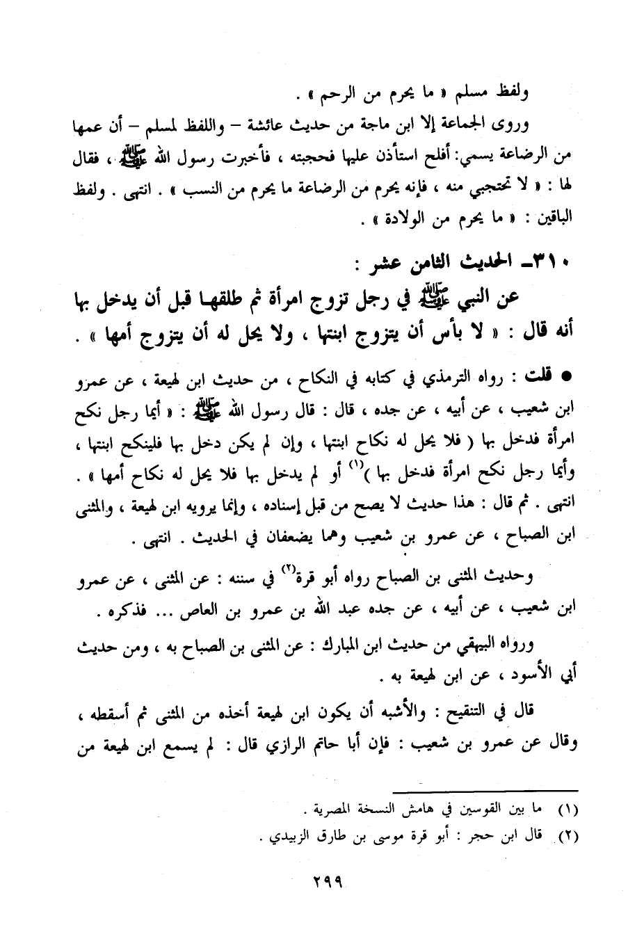 قلت رَوَاهُ التِّرْمِذِيّ فِي كِتَابه فِي النِّكَاح من حَدِيث ابْن لَهِيعَة عَن عَمْرو ابْن شُعَيْب عَن أَبِيه عَن جده قَالَ قَالَ رَسُول الله صَلَّى اللَّهُ عَلَيْهِ وَسَلَّم َ أَيّمَا رجل نكح امْرَأَة فَدخل بهَا فَلَا يحل لَهُ نِكَاح ابْنَتهَا وَإِن لم يكن دخل بهَا فَلْيَنْكِح ابْنَتهَا وَأَيّمَا رجل نكح امْرَأَة فَدخل بهَا أَو لم يدْخل بهَا فَلَا يحل لَهُ نِكَاح أمهَا انْتَهَى ثمَّ قَالَ هَذَا حَدِيث لَا يَصح من قبل إِسْنَاده وَإِنَّمَا يرويهِ ابْن لَهِيعَة والمثنى ابْن الصَّباح عَن عَمْرو بن شُعَيْب وهما يُضعفَانِ فِي الحَدِيث انْتَهَى