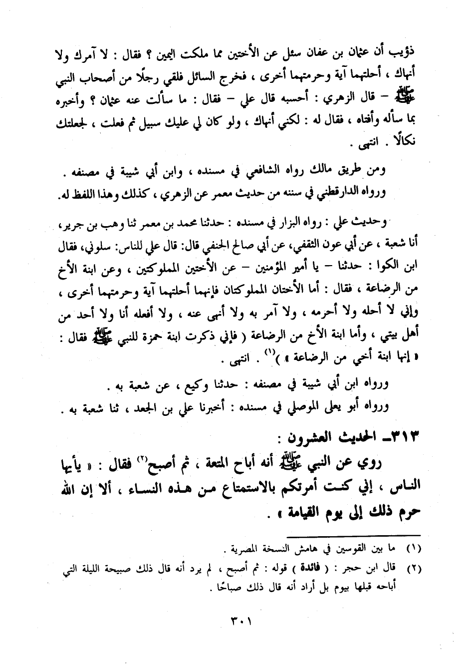 ذُؤَيْب أَن عُثْمَان بن عَفَّان سُئِلَ عَن الْأُخْتَيْنِ مِمَّا ملكت الْيَمين فَقَالَ لَا آمُرك وَلَا أَنهَاك أَحَلَّتْهُمَا آيَة وحرمتهما أُخْرَى فَخرج السَّائِل فلقي رجلا من أَصْحَاب النَّبِي صَلَّى اللَّهُ عَلَيْهِ وَسَلَّم َ قَالَ الزُّهْرِيّ أَحْسبهُ قَالَ عَلّي فَقَالَ مَا سَأَلت عَنهُ عُثْمَان وَأخْبرهُ بِمَا سَأَلَهُ وَأَفْتَاهُ فَقَالَ لَهُ لكني أَنهَاك وَلَو كَانَ لي عَلَيْك سَبِيل ثمَّ فعلت لَجَعَلْتُك نكالا انْتَهَى