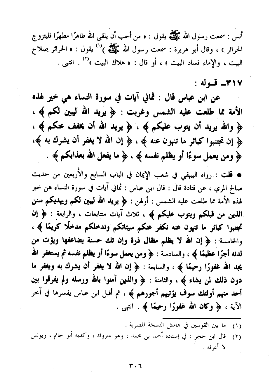 قلت رَوَاهُ الْبَيْهَقِيّ فِي شعب الْإِيمَان فِي الْبَاب السَّابِع وَالْأَرْبَعِينَ من حَدِيث صَالح المري عَن قَتَادَة قَالَ قَالَ ابْن عَبَّاس ثَمَانِي آيَات فِي سُورَة النِّسَاء هن خير لهَذِهِ الْأمة مِمَّا طلعت عَلَيْهِ الشَّمْس أولهنَّ يُرِيد الله ليبين لكم وَيهْدِيكُمْ سنَن الَّذين من قبلكُمْ وَيَتُوب عَلَيْكُم ثَلَاث آيَات مُتَتَابِعَات وَالرَّابِعَة إِن تجتنبوا كَبَائِر مَا تنهون عَنهُ نكفر عَنْكُم سَيِّئَاتكُمْ وَنُدْخِلكُمْ مدخلًا كَرِيمًا وَالْخَامِسَة إِن الله لَا يظلم مِثْقَال ذرة وَإِن تَكُ حَسَنَة يُضَاعِفهَا وَيُؤْت من لَدنه أجرا عَظِيما وَالسَّادِسَة (وَمن يعْمل سوءا أَو يظلم نَفسه ثمَّ يسْتَغْفر الله يجد الله غَفُورًا رحِيما) وَالسَّابِعَة (إِن الله لَا يغْفر أَن يُشْرك بِهِ وَيغْفر مَا دون ذَلِك لمن يَشَاء) وَالثَّامِنَة وَالَّذين آمنُوا بِاللَّه وَرُسُله وَلم يفرقُوا بَين أحد مِنْهُم أُولَئِكَ سَوف يُؤْتِيهم أُجُورهم ثمَّ أقبل ابْن عَبَّاس يُفَسِّرهَا فِي آخر الْآيَة وَكَانَ الله غَفُورًا رحِيما انْتَهَى