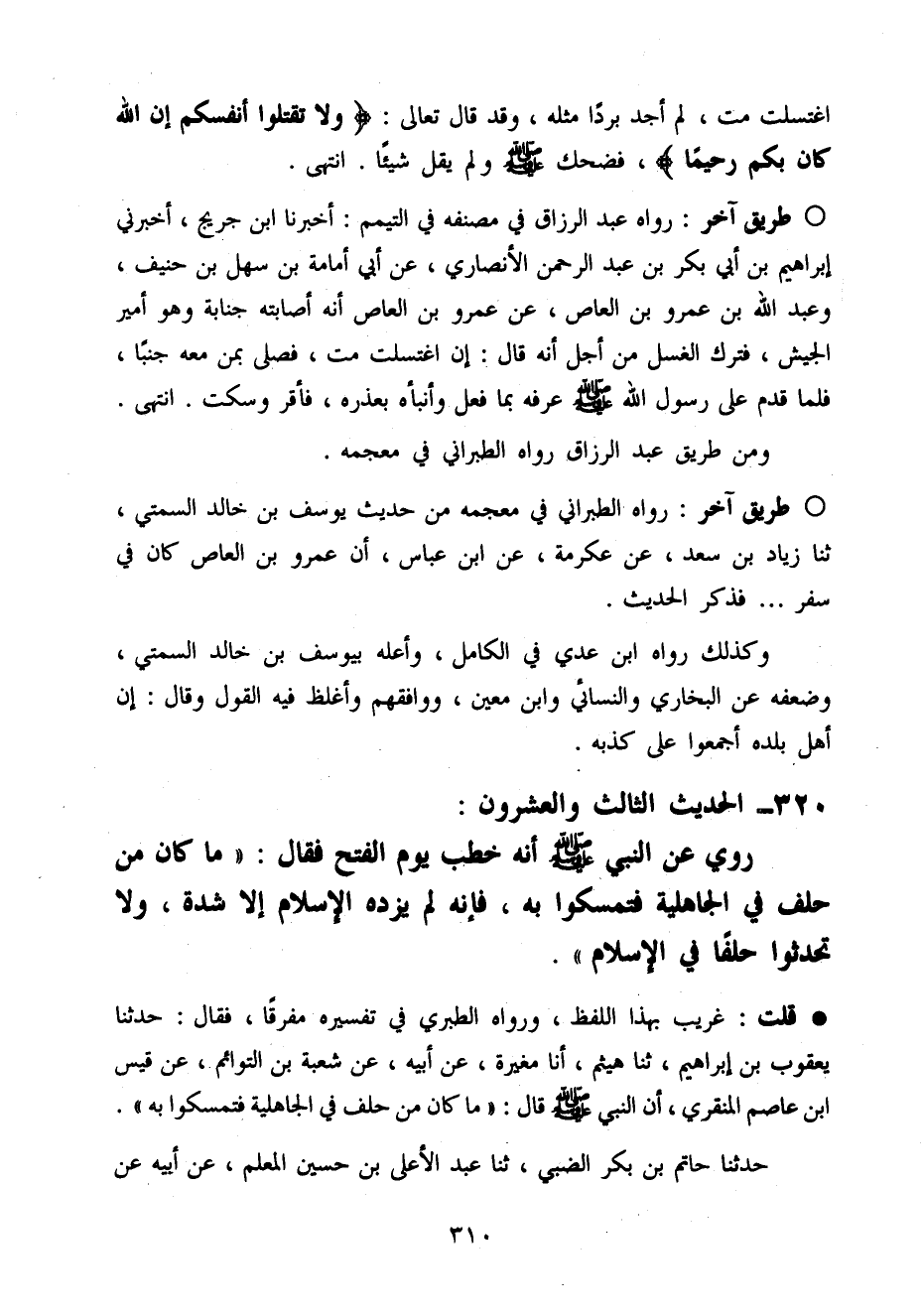 طَرِيق آخر رَوَاهُ عبد الرَّزَّاق فِي مُصَنفه فِي التَّيَمُّم أخبرنَا ابْن جريج أَخْبرنِي إِبْرَاهِيم بن أبي بكر بن عبد الرَّحْمَن الْأنْصَارِيّ عَن أبي أُمَامَة بن سهل بن حنيف وَعبد الله بن عَمْرو بن الْعَاصِ عَن عَمْرو بن الْعَاصِ أَنه أَصَابَته جَنَابَة وَهُوَ أَمِير الْجَيْش فَترك الْغسْل من أجل أَنه قَالَ إِن اغْتَسَلت مت فَصَلى بِمن مَعَه جنبا فَلَمَّا قدم عَلَى رَسُول الله صَلَّى اللَّهُ عَلَيْهِ وَسَلَّم َ عرفه بِمَا فصل وَأَنْبَأَهُ بِعُذْرِهِ فَأقر وَسكت انْتَهَى