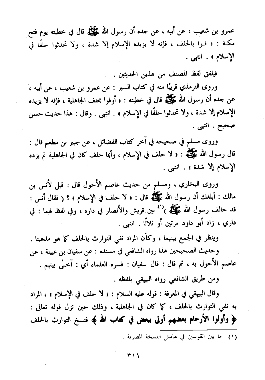 وَرَوَى التِّرْمِذِيّ قَرِيبا مِنْهُ فِي كتاب السّير عَن عَمْرو بن شُعَيْب عَن أَبِيه عَن جده أَن رَسُول الله صَلَّى اللَّهُ عَلَيْهِ وَسَلَّم َ قَالَ فِي خطبَته أَوْفوا بِحلف الْجَاهِلِيَّة فَإِنَّهُ لَا يزِيدهُ الْإِسْلَام إِلَّا شدَّة وَلَا تحدثُوا حلفا فِي الْإِسْلَام انْتَهَى وَقَالَ هَذَا حَدِيث حسن صَحِيح انْتَهَى