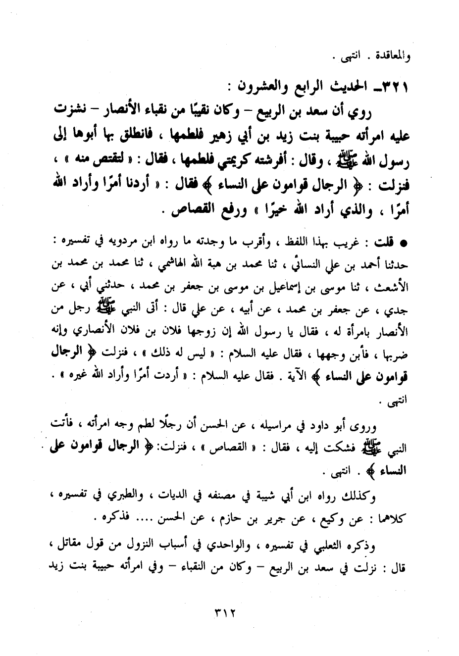 رُوِيَ أَن سعد بن الرّبيع وَكَانَ نَقِيبًا من نقباء الْأَنْصَار نشزت عَلَيْهِ امْرَأَته حَبِيبَة بنت زيد بن أبي زُهَيْر فلطمها فَانْطَلق بهَا أَبوهَا إِلَى رَسُول الله صَلَّى اللَّهُ عَلَيْهِ وَسَلَّم َ وَقَالَ أَفرَشته كَرِيمَتي فلطمها فَقَالَ لتقْتَص مِنْهُ فَنزلت الرِّجَال قوامون عَلَى النِّسَاء فَقَالَ أردنَا أمرا وَأَرَادَ الله أمرا وَالَّذِي أَرَادَ الله خيرا وَرفع الْقصاص