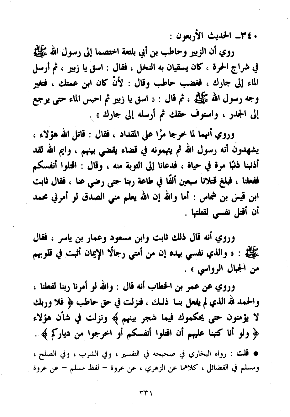 رُوِيَ أَن الزُّبَيْر وحاطب بن أبي بلتعة اخْتَصمَا إِلَى رَسُول الله صَلَّى اللَّهُ عَلَيْهِ وَسَلَّم َ فِي شراج الْحرَّة كَانَ يسقيان بِهِ النّخل فَقَالَ اسْقِ يَا زبير ثمَّ أرسل المَاء إِلَى جَارك فَغَضب حَاطِب وَقَالَ لِأَن كَانَ ابْن عَمَّتك فَتغير وَجه رَسُول الله صَلَّى اللَّهُ عَلَيْهِ وَسَلَّم َ ثمَّ قَالَ اسْقِ يَا زبير ثمَّ احْبِسْ المَاء حَتَّى يرجع إِلَى الْجدر وَاسْتَوْفِ حَقك ثمَّ أرْسلهُ إِلَى جَارك