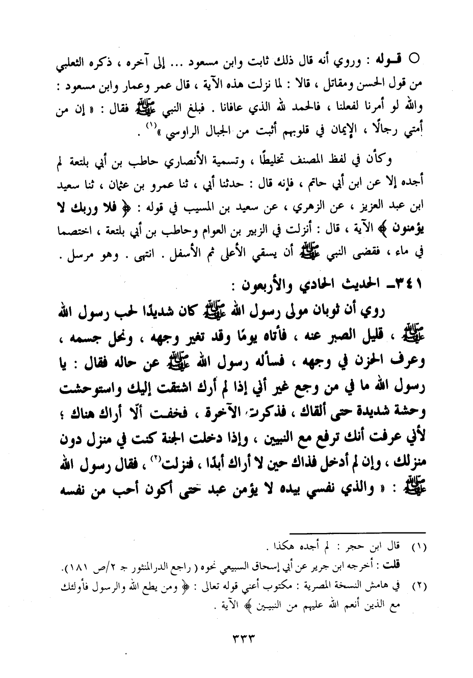 رُوِيَ أَن ثَوْبَان مولَى رَسُول الله صَلَّى اللَّهُ عَلَيْهِ وَسَلَّم َ كَانَ شَدِيدا لحب رَسُول الله صَلَّى اللَّهُ عَلَيْهِ وَسَلَّم َ قَلِيل الصَّبْر عَنهُ فَأَتَاهُ يَوْمًا وَقد تغير وَجهه وَنحل جِسْمه وَعرف الْحزن فِي وَجهه فَسَأَلَهُ رَسُول الله صَلَّى اللَّهُ عَلَيْهِ وَسَلَّم َ عَن حَاله فَقَالَ يَا رَسُول الله مَا فِي من وجع غير أَنِّي إِذا لم أرك اشْتقت إِلَيْك وَاسْتَوْحَشْت وَحْشَة شَدِيدَة حَتَّى أَلْقَاك فَذكرت الْآخِرَة فَخفت أَلا أَرَاك هُنَاكَ لِأَنِّي عرفت أَنَّك ترفع مَعَ النَّبِيين وَإِذا دخلت الْجنَّة كنت فِي منزل دون مَنْزِلك وَإِن لم أَدخل فَذَاك حِين لَا أَرَاك أبدا فَنزلت فَقَالَ رَسُول الله صَلَّى اللَّهُ عَلَيْهِ وَسَلَّم َ وَالَّذِي نَفسِي بِيَدِهِ لَا يُؤمن عبد حَتَّى أكون أحب من نَفسه