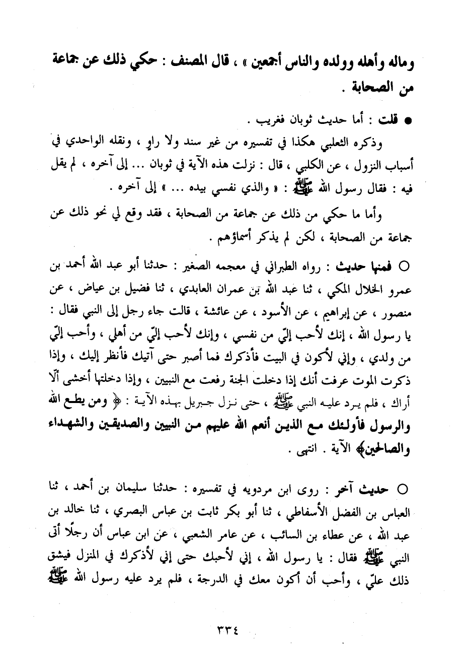 فَمِنْهَا حَدِيث رَوَاهُ الطَّبَرَانِيّ فِي مُعْجَمه الصَّغِير حَدثنَا أَبُو عبد الله أَحْمد بن عَمْرو الْخلال الْمَكِّيّ ثَنَا عبد الله بن عمرَان العابدي ثَنَا فُضَيْل بن عِيَاض عَن مَنْصُور عَن إِبْرَاهِيم عَن الْأسود عَن عَائِشَة قَالَت جَاءَ رجل إِلَى النَّبِي فَقَالَ يَا رَسُول الله إِنَّك لأحب إِلَيّ من نَفسِي وَإنَّك لأحب إِلَيّ من أَهلِي وَأحب إِلَيّ من وَلَدي وَإِنِّي لأَكُون فِي الْبَيْت فَأَذْكرك فَمَا أَصْبِر حَتَّى آتِيك فَأنْظر إِلَيْك وَإِذا ذكرت الْمَوْت عرفت أَنَّك إِذا دخلت الْجنَّة رفعت مَعَ النَّبِيين وَإِذا دَخَلتهَا أخْشَى أَلا أَرَاك فَلم يرد عَلَيْهِ النَّبِي صَلَّى اللَّهُ عَلَيْهِ وَسَلَّم َ حَتَّى نزل جِبْرِيل بِهَذِهِ الْآيَة وَمن يطع الله وَالرَّسُول فَأُولَئِك مَعَ الَّذين أنعم الله عَلَيْهِم من النَّبِيين وَالصديقين وَالشُّهَدَاء وَالصَّالِحِينَ الْآيَة انْتَهَى