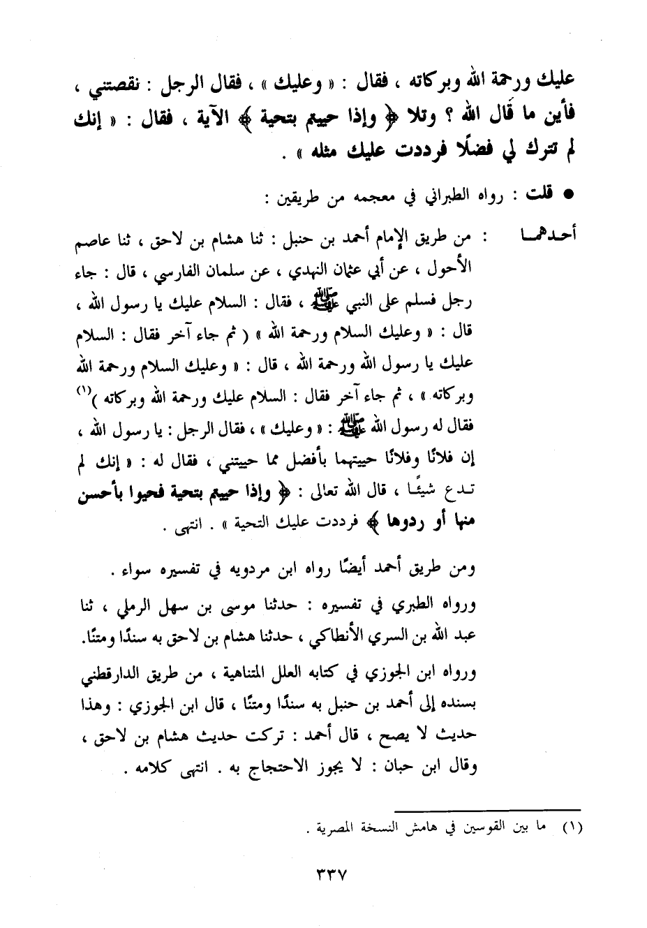 أَحدهمَا من طَرِيق الْأَمَام أَحْمد بن حَنْبَل ثَنَا هِشَام بن لَاحق ثَنَا عَاصِم الْأَحول عَن أبي عُثْمَان النَّهْدِيّ عَن سلمَان الْفَارِسِي قَالَ جَاءَ رجل فَسلم عَلَى النَّبِي صَلَّى اللَّهُ عَلَيْهِ وَسَلَّم َ فَقَالَ السَّلَام عَلَيْك يَا رَسُول الله قَالَ وَعَلَيْك السَّلَام وَرَحْمَة الله ثمَّ جَاءَ آخر فَقَالَ السَّلَام عَلَيْك يَا رَسُول الله وَرَحْمَة الله قَالَ وَعَلَيْك السَّلَام وَرَحْمَة الله وَبَرَكَاته ثمَّ جَاءَ آخر فَقَالَ السَّلَام عَلَيْك وَرَحْمَة الله وَبَرَكَاته فَقَالَ لَهُ رَسُول الله صَلَّى اللَّهُ عَلَيْهِ وَسَلَّم َ وَعَلَيْك فَقَالَ الرجل يَا رَسُول الله إِن فلَانا وَفُلَانًا حييتهما بِأَفْضَل مِمَّا حييتني فَقَالَ لَهُ إِنَّك لم تدع شَيْئا قَالَ الله تَعَالَى وَإِذا حييتُمْ بِتَحِيَّة فَحَيوا بِأَحْسَن مِنْهَا أَو ردوهَا فَرددت عَلَيْك التَّحِيَّة انْتَهَى