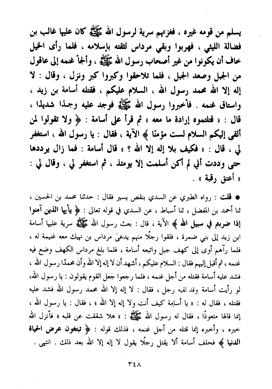 قلت رَوَاهُ الطَّبَرِيّ عَن السّديّ بِنَقص يسير فَقَالَ حَدثنَا مُحَمَّد بن الْحُسَيْن ثَنَا أَحْمد بن الْمفضل ثَنَا أَسْبَاط عَن السّديّ فِي قَوْله تَعَالَى يأيها الَّذين آمنُوا إِذا ضَرَبْتُمْ فِي سَبِيل الله الْآيَة قَالَ بعث رَسُول الله صَلَّى اللَّهُ عَلَيْهِ وَسَلَّم َ سَرِيَّة عَلَيْهَا أُسَامَة ابْن زيد إِلَى بني ضَمرَة فَلَقوا رجلا مِنْهُم يُدعَى مرداس بن نهيك مَعَه غنيمَة لَهُ فَلَمَّا رَآهُمْ أَوَى إِلَى كَهْف جبل وَاتبعهُ أُسَامَة فَلَمَّا بلغ مرداس الْكَهْف وضع فِيهِ غنمه ثمَّ أقبل إِلَيْهِم فَقَالَ السَّلَام عَلَيْكُم أشهد أَن لَا إِلَه إِلَّا الله وَأَن مُحَمَّدًا رَسُول الله فَشد عَلَيْهِ أُسَامَة فَقتله من أجل غنمه فَلَمَّا رجعُوا جعل الْقَوْم يَقُولُونَ يَا رَسُول الله لَو رَأَيْت أُسَامَة وَقد لقِيه رجل فَقَالَ لَا إِلَه إِلَّا الله مُحَمَّد رَسُول الله فَشد عَلَيْهِ فَقتله فَقَالَ لَهُ يَا أُسَامَة كَيفَ أَنْت وَلَا إِلَه إِلَّا الله فَقَالَ يَا رَسُول الله إِنَّمَا قَالَهَا مُتَعَوِّذًا فَقَالَ لَهُ رَسُول الله صَلَّى اللَّهُ عَلَيْهِ وَسَلَّم َ هلا شققت عَن قلبه فَأنْزل الله خَبره وَأخْبرهُ إِنَّمَا قَتله من أجل غنمه فَذَلِك قَوْله تَبْتَغُونَ عرض الْحَيَاة الدُّنْيَا فَحلف أُسَامَة أَلا يقتل رجلا يَقُول لَا إِلَه إِلَّا الله بعد ذَلِك انْتَهَى