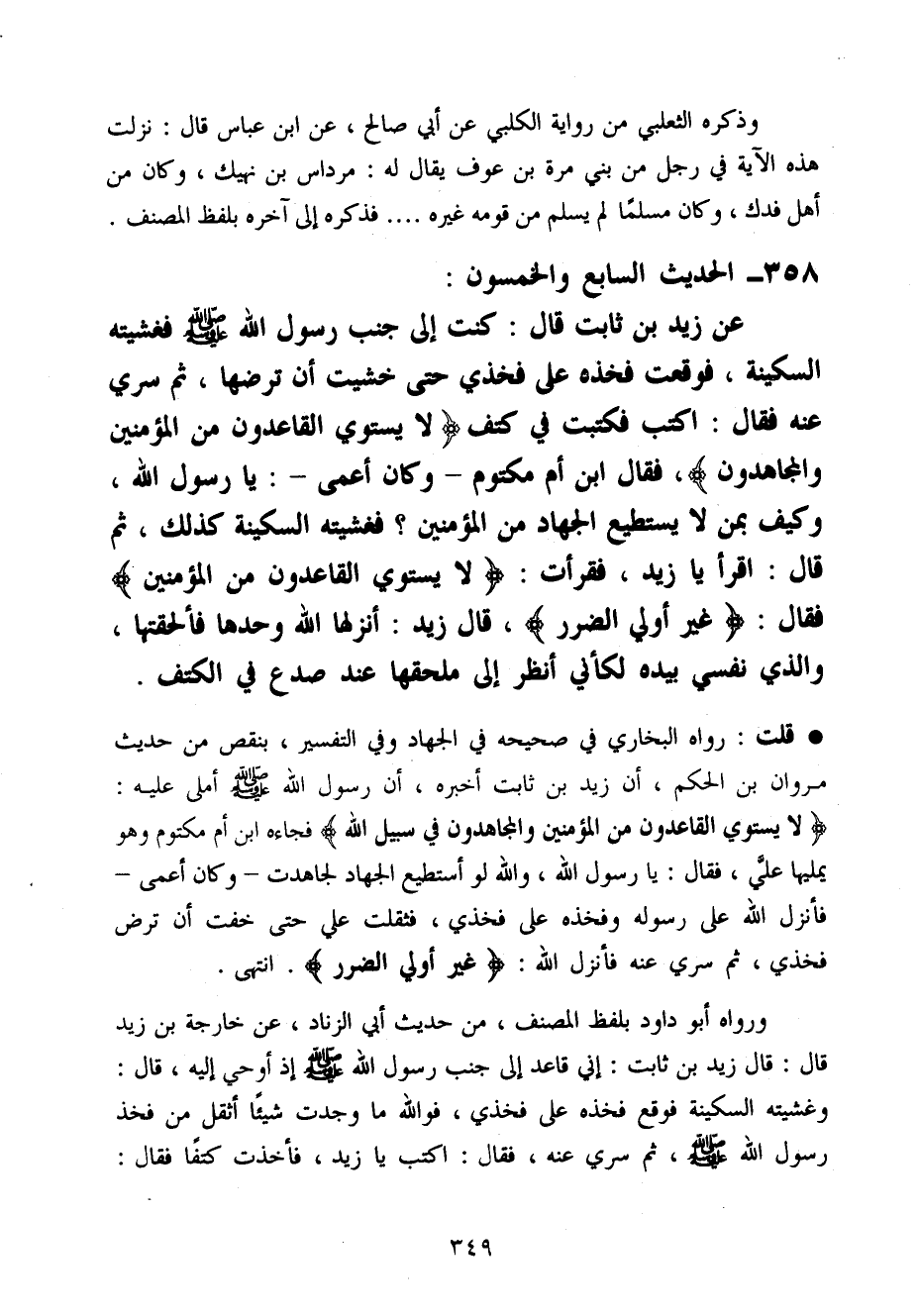 عَن زيد بن ثَابت قَالَ كنت إِلَى جنب رَسُول الله صَلَّى اللَّهُ عَلَيْهِ وَسَلَّم َ فَغَشِيتهُ السكينَة فَوَقَعت فَخذه عَلَى فَخذي حَتَّى خشيت أَن تَرضهَا ثمَّ سري عَنهُ فَقَالَ اكْتُبْ فَكتبت فِي كتف لَا يَسْتَوِي الْقَاعِدُونَ من الْمُؤمنِينَ وَالْمُجَاهِدُونَ فَقَالَ ابْن أم مَكْتُوم وَكَانَ أَعْمَى يَا رَسُول الله وَكَيف بِمن لَا يَسْتَطِيع الْجِهَاد من الْمُؤمنِينَ فَغَشِيتهُ السكينَة كَذَلِك ثمَّ قَالَ اقْرَأ يَا زيد فَقَرَأت (لَا يَسْتَوِي الْقَاعِدُونَ من الْمُؤمنِينَ) فَقَالَ غير أولي الضَّرَر قَالَ زيد أنزلهَا الله وَحدهَا فَأَلْحَقْتهَا وَالَّذِي نَفسِي بِيَدِهِ لكَأَنِّي أنظر إِلَى مُلْحَقهَا عِنْد صدع فِي الْكَتف