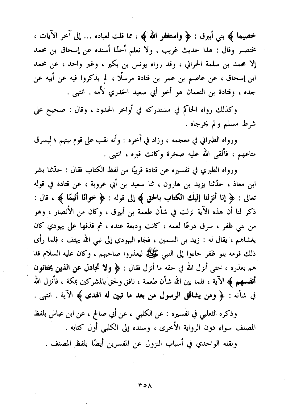 خصيما) بني أُبَيْرِق واستغفر الله مِمَّا قلت لِعِبَادِهِ ... إِلَى آخِره الْآيَات مُخْتَصر وَقَالَ هَذَا حَدِيث غَرِيب وَلَا نعلم أحدا أسْندهُ عَن إِسْحَاق بن مُحَمَّد إِلَّا مُحَمَّد بن سَلمَة الْحَرَّانِي وَقد رَوَاهُ يُونُس بن بكير وَغير وَاحِد عَن مُحَمَّد ابْن إِسْحَاق عَن عَاصِم بن عمر بن قَتَادَة مُرْسلا لم يذكرُوا فِيهِ عَن أَبِيه عَن جده وَقَتَادَة بن النُّعْمَان هُوَ أَخُو أبي سعيد الْخُدْرِيّ لأمه انْتَهَى