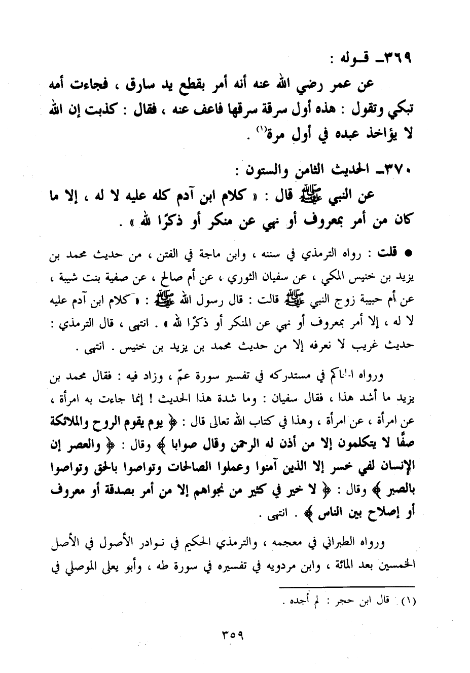 قلت رَوَاهُ التِّرْمِذِيّ فِي سنَنه وَابْن ماجة فِي الْفِتَن من حَدِيث مُحَمَّد بن يزِيد بن خُنَيْس الْمَكِّيّ عَن سُفْيَان الثَّوْريّ عَن أم صَالح عَن صَفِيَّة بنت شيبَة عَن أم حَبِيبَة زوج النَّبِي صَلَّى اللَّهُ عَلَيْهِ وَسَلَّم َ قَالَت قَالَ رَسُول الله صَلَّى اللَّهُ عَلَيْهِ وَسَلَّم َ كَلَام ابْن آدم عَلَيْهِ لَا لَهُ إِلَّا أَمر بِمَعْرُوف أَو نهي عَن الْمُنكر أَو ذكرا لله انْتَهَى قَالَ التِّرْمِذِيّ حَدِيث غَرِيب لَا نعرفه إِلَّا من حَدِيث مُحَمَّد بن يزِيد بن خُنَيْس انْتَهَى