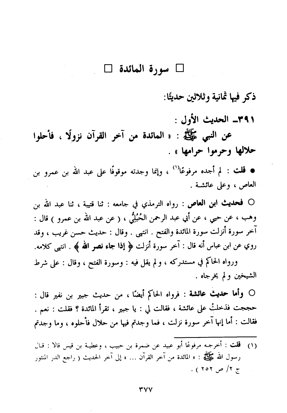 فَحَدِيث ابْن الْعَاصِ رَوَاهُ التِّرْمِذِيّ فِي جَامعه ثَنَا قُتَيْبَة ثَنَا عبد الله بن وهب عَن حييّ عَن أبي عبد الرَّحْمَن الحبلي عَن عبد الله بن عَمْرو قَالَ آخر سُورَة أنزلت سُورَة الْمَائِدَة وَالْفَتْح انْتَهَى وَقَالَ حَدِيث حسن غَرِيب وَقد رُوِيَ عَن ابْن عَبَّاس أَنه قَالَ آخر سُورَة أنزلت إِذا جَاءَ نصر الله انْتَهَى كَلَامه