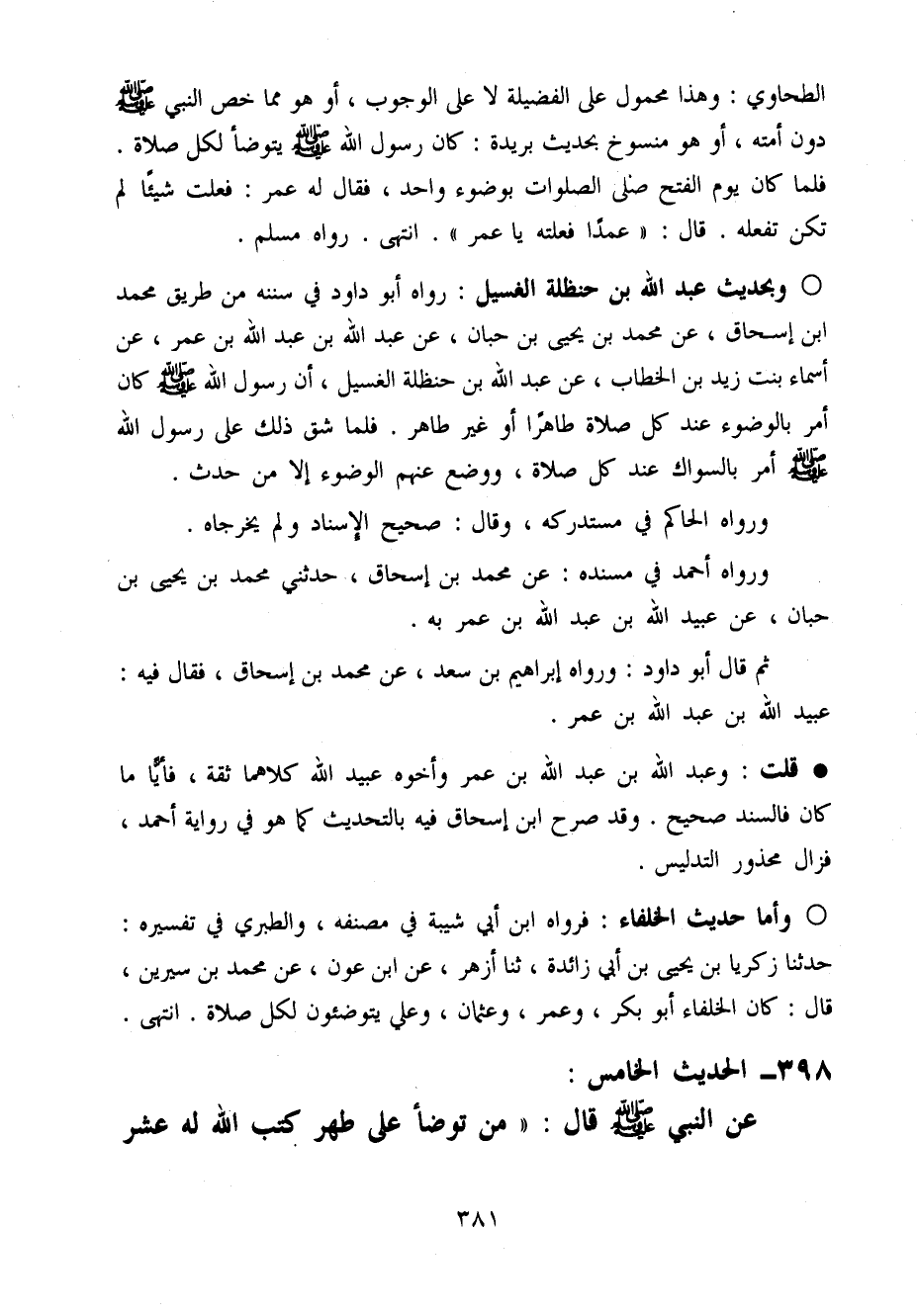 وَبِحَدِيث عبد الله بن حَنْظَلَة الغسيل رَوَاهُ أَبُو دَاوُد فِي سنَنه من طَرِيق مُحَمَّد ابْن إِسْحَاق عَن مُحَمَّد بن يَحْيَى بن حبَان عَن عبد الله بن عبد الله بن عمر عَن أَسمَاء بنت زيد بن الْخطاب عَن عبد الله بن حَنْظَلَة الغسيل أَن رَسُول الله صَلَّى اللَّهُ عَلَيْهِ وَسَلَّم َ كَانَ أَمر بِالْوضُوءِ عِنْد كل صَلَاة طَاهِرا أَو غير طَاهِر فَلَمَّا شقّ ذَلِك عَلَى رَسُول الله صَلَّى اللَّهُ عَلَيْهِ وَسَلَّم َ أَمر بِالسِّوَاكِ عِنْد كل صَلَاة وَوضع عَنْهُم الْوضُوء إِلَّا من حدث