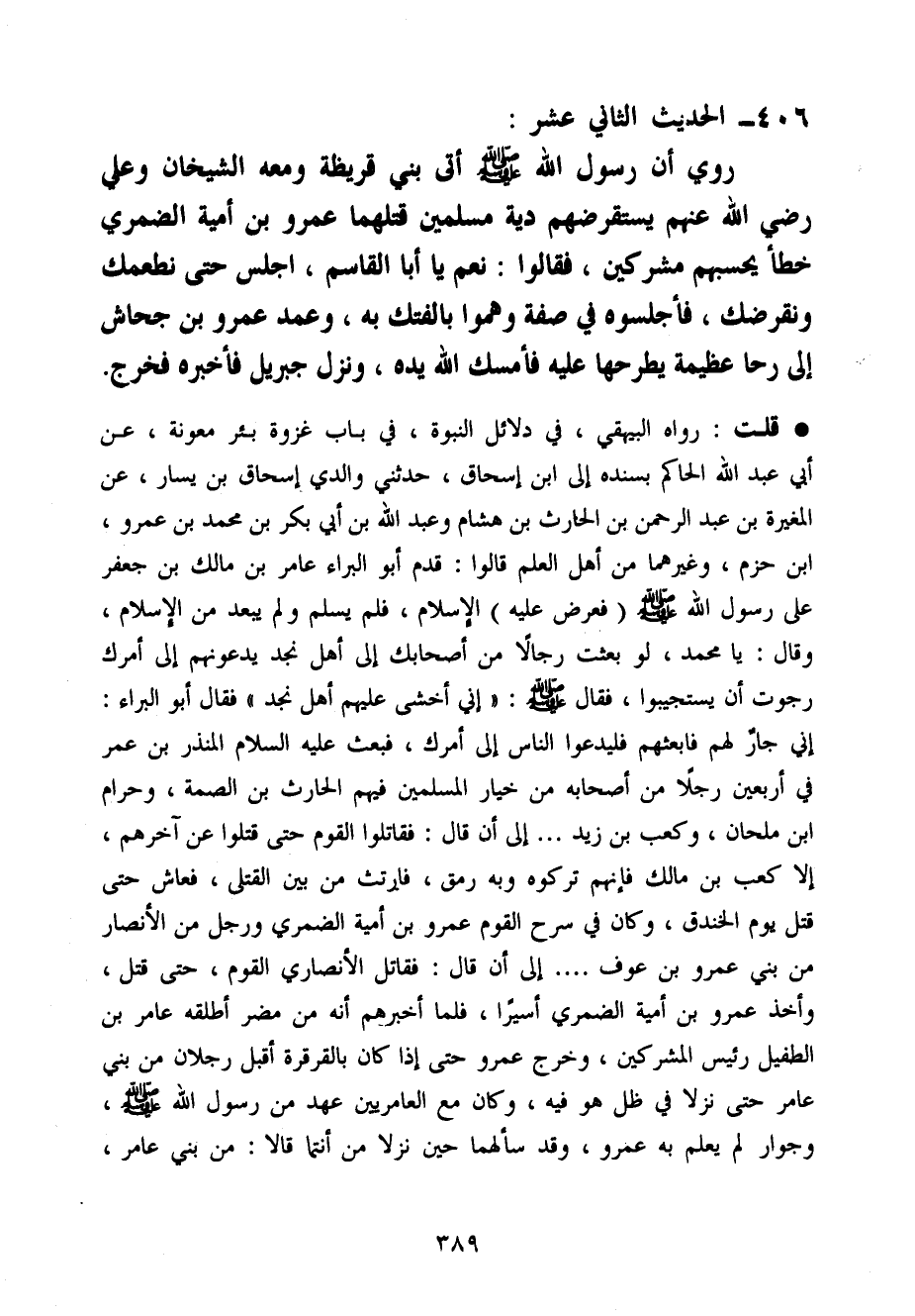 قلت رَوَاهُ الْبَيْهَقِيّ فِي دَلَائِل النُّبُوَّة فِي بَاب غَزْوَة بِئْر مَعُونَة عَن أبي عبد الله الْحَاكِم بِسَنَدِهِ إِلَى ابْن إِسْحَاق حَدثنِي وَالِدي إِسْحَاق بن يسَار عَن الْمُغيرَة بن عبد الرَّحْمَن بن الْحَارِث بن هِشَام وَعبد الله بن أبي بكر بن مُحَمَّد بن عَمْرو ابْن حزم وَغَيرهمَا من أهل الْعلم قَالُوا قدم أَبُو الْبَراء عَامر بن مَالك بن جَعْفَر عَلَى رَسُول الله صَلَّى اللَّهُ عَلَيْهِ وَسَلَّم َ فَعرض عَلَيْهِ الْإِسْلَام فَلم يسلم وَلم يبعد من الْإِسْلَام وَقَالَ يَا مُحَمَّد لَو بعثت رجَالًا من أَصْحَابك إِلَى أهل نجد يَدعُونَهُمْ إِلَى أَمرك رَجَوْت أَن يَسْتَجِيبُوا فَقَالَ صَلَّى اللَّهُ عَلَيْهِ وَسَلَّم َ إِنِّي أخْشَى عَلَيْهِم أهل نجد فَقَالَ أَبُو الْبَراء إِنِّي جَار لَهُم فابعثهم فَلْيَدعُوا النَّاس إِلَى أَمرك فَبعث عَلَيْهِ السَّلَام الْمُنْذر بن عمر فِي أَرْبَعِينَ رجلا من أَصْحَابه من خِيَار الْمُسلمين فيهم الْحَارِث بن الصمَّة وَحرَام ابْن ملْحَان وَكَعب بن زيد ... إِلَى أَن قَالَ فَقَاتلُوا الْقَوْم حَتَّى قتلوا عَن آخِرهم إِلَّا كَعْب بن مَالك فَإِنَّهُم تَرَكُوهُ وَبِه رَمق فَارْتثَّ من بَين الْقَتْلَى فَعَاشَ حَتَّى قتل يَوْم الخَنْدَق وَكَانَ فِي سرح الْقَوْم عَمْرو بن أُميَّة الضمرِي وَرجل من الْأَنْصَار من بني عَمْرو بن عَوْف ... إِلَى أَن قَالَ فقاتل الْأنْصَارِيّ الْقَوْم حَتَّى قتل وَأخذ عَمْرو بن أُميَّة الضمرِي أَسِيرًا فَلَمَّا أخْبرهُم أَنه من مُضر أطلقهُ عَامر بن الطُّفَيْل رَئِيس الْمُشْركين وَخرج عَمْرو حَتَّى إِذا كَانَ بِالْقَرْقَرَةِ أقبل رجلَانِ من بني عَامر حَتَّى نزلا فِي ظلّ هُوَ فِيهِ وَكَانَ مَعَ الْعَامِرِيين عهد من رَسُول الله صَلَّى اللَّهُ عَلَيْهِ وَسَلَّم َ وَجوَار لم يعلم بِهِ عَمْرو وَقد سَأَلَهُمَا حِين نزلا من أَنْتُمَا قَالَا من بني عَامر