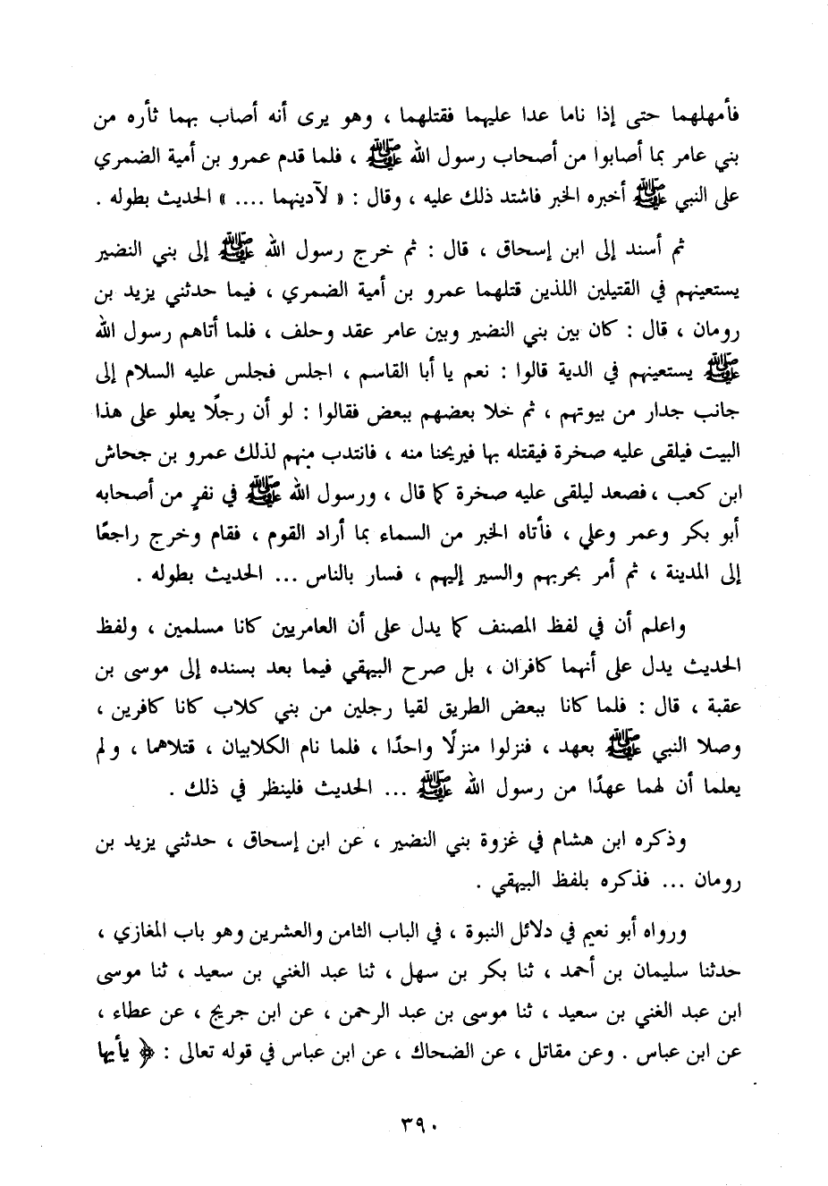 فأمهلهما حَتَّى إِذا نَامَا عدا عَلَيْهِمَا فَقَتَلَهُمَا وَهُوَ يرَى أَنه أصَاب بهما ثَأْره من بني عَامر بِمَا أَصَابُوا من أَصْحَاب رَسُول الله صَلَّى اللَّهُ عَلَيْهِ وَسَلَّم َ فَلَمَّا قدم عَمْرو بن أُميَّة الضمرِي عَلَى النَّبِي صَلَّى اللَّهُ عَلَيْهِ وَسَلَّم َ أخبرهُ الْخَبَر فَاشْتَدَّ ذَلِك عَلَيْهِ وَقَالَ لآدينهما الحَدِيث بِطُولِهِ