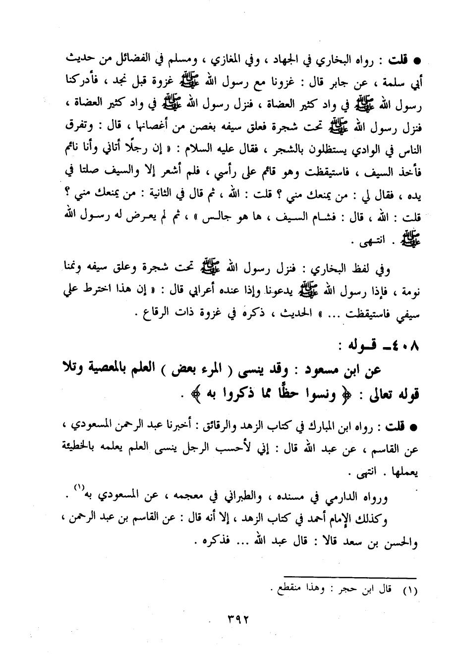 قلت رَوَاهُ ابْن الْمُبَارك فِي كتاب الزّهْد وَالرَّقَائِق أخبرنَا عبد الرَّحْمَن المَسْعُودِيّ عَن الْقَاسِم عَن عبد الله قَالَ إِنِّي لأحسب الرجل ينسَى الْعلم يُعلمهُ بالخطيئة يعلمهَا انْتَهَى