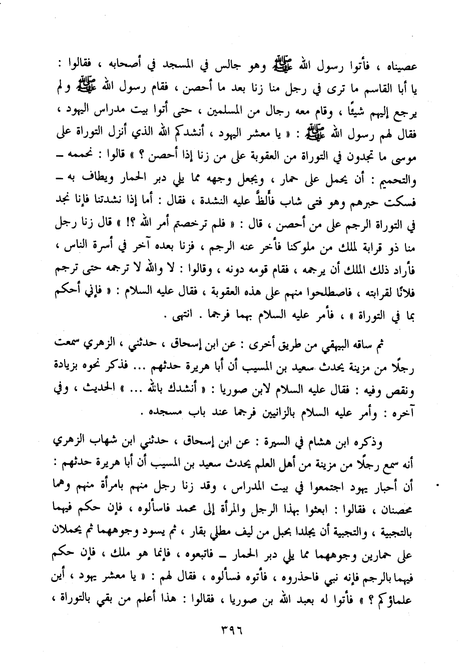 عَصَيْنَاهُ فَأتوا رَسُول الله صَلَّى اللَّهُ عَلَيْهِ وَسَلَّم َ وَهُوَ جَالس فِي الْمَسْجِد فِي أَصْحَابه فَقَالُوا يَا أَبَا الْقَاسِم مَا ترَى فِي رجل منا زنا بعد مَا أحصن فَقَامَ رَسُول الله صَلَّى اللَّهُ عَلَيْهِ وَسَلَّم َ وَلم يرجع إِلَيْهِم شَيْئا وَقَامَ مَعَه رجال من الْمُسلمين حَتَّى أَتَوا بَيت مِدْرَاس الْيَهُود فَقَالَ لَهُم رَسُول الله صَلَّى اللَّهُ عَلَيْهِ وَسَلَّم َ يَا معشر الْيَهُود أنْشدكُمْ الله الَّذِي أنزل التَّوْرَاة عَلَى مُوسَى مَا تَجِدُونَ فِي التَّوْرَاة من الْعقُوبَة عَلَى من زنا إِذا أحصن قَالُوا نحممه وَالتَّحْمِيم أَن يحمل عَلَى حمَار وَيجْعَل وَجهه مِمَّا يَلِي دبر الْحمار وَيُطَاف بِهِ فَسكت حَبْرهمْ وَهُوَ فَتى شَاب فَأَلَظَّ عَلَيْهِ النِّشْدَة فَقَالَ أما إِذا نَشَدتنَا فَإنَّا نجد فِي التَّوْرَاة الرَّجْم عَلَى من أحصن قَالَ فَلم تَرَخَّصْتُمْ أَمر الله قَالَ زنا رجل منا ذُو قرَابَة لملك من مُلُوكنَا فَأخر عَنهُ الرَّجْم فزنا بعده آخر فِي أسرة النَّاس فَأَرَادَ ذَلِك الْملك أَن يَرْجُمهُ فَقَامَ قومه دونه وَقَالُوا لَا وَالله لَا تَرْجمهُ حَتَّى ترْجم فلَانا لِقَرَابَتِهِ فَاصْطَلَحُوا مِنْهُم عَلَى هَذِه الْعقُوبَة فَقَالَ عَلَيْهِ السَّلَام فَإِنِّي أحكم بِمَا فِي التَّوْرَاة فَأمر عَلَيْهِ السَّلَام بهما فَرُجِمَا انْتَهَى