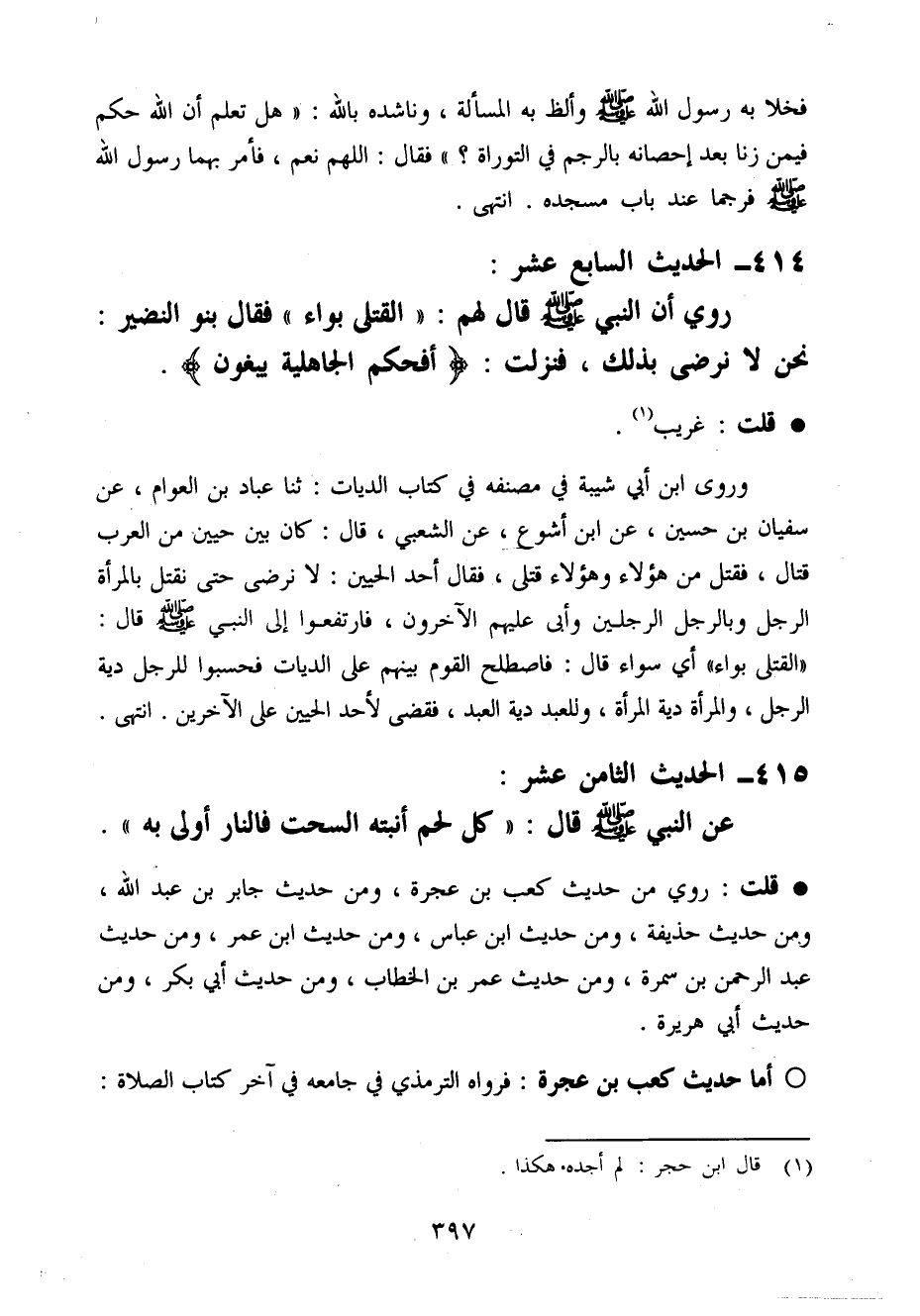 وَرَوَى ابْن أبي شيبَة فِي مُصَنفه فِي كتاب الدِّيات ثَنَا عباد بن الْعَوام عَن سُفْيَان بن حُسَيْن عَن ابْن أَشوع عَن الشّعبِيّ قَالَ كَانَ بَين حيين من الْعَرَب قتال فَقتل من هَؤُلَاءِ وَهَؤُلَاء قَتْلَى فَقَالَ أحد الْحَيَّيْنِ لَا نرضى حَتَّى نقْتل بِالْمَرْأَةِ الرجل وَبِالرجلِ الرجلَيْن وَأَبَى عَلَيْهِم الْآخرُونَ فَارْتَفعُوا إِلَى النَّبِي صَلَّى اللَّهُ عَلَيْهِ وَسَلَّم َ قَالَ الْقَتْلَى بَوَاء أَي سَوَاء قَالَ فَاصْطَلَحَ الْقَوْم بَينهم عَلَى الدِّيات فَحَسبُوا للرجل دِيَة الرجل وَالْمَرْأَة دِيَة الْمَرْأَة وَلِلْعَبْدِ دِيَة العَبْد فَقَضَى لأحد الْحَيَّيْنِ عَلَى الآخرين انْتَهَى