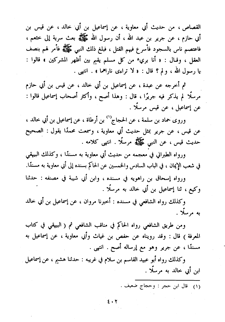 الْقصاص من حَدِيث أبي مُعَاوِيَة عَن إِسْمَاعِيل بن أبي خَالِد عَن قيس بن أبي حَازِم عَن جرير بن عبد الله أَن رَسُول الله صَلَّى اللَّهُ عَلَيْهِ وَسَلَّم َ بعث سَرِيَّة إِلَى خثعم فاعتصم نَاس بِالسُّجُود فأسرع فيهم الْقَتْل فَبلغ ذَلِك النَّبِي صَلَّى اللَّهُ عَلَيْهِ وَسَلَّم َ فَأمر لَهُم بِنصْف الْعقل وَقَالَ أَنا بَرِيء من كل مُسلم يُقيم بَين أظهر الْمُشْركين قَالُوا يَا رَسُول الله وَلم قَالَ لَا ترَاءَى ناراهما انْتَهَى