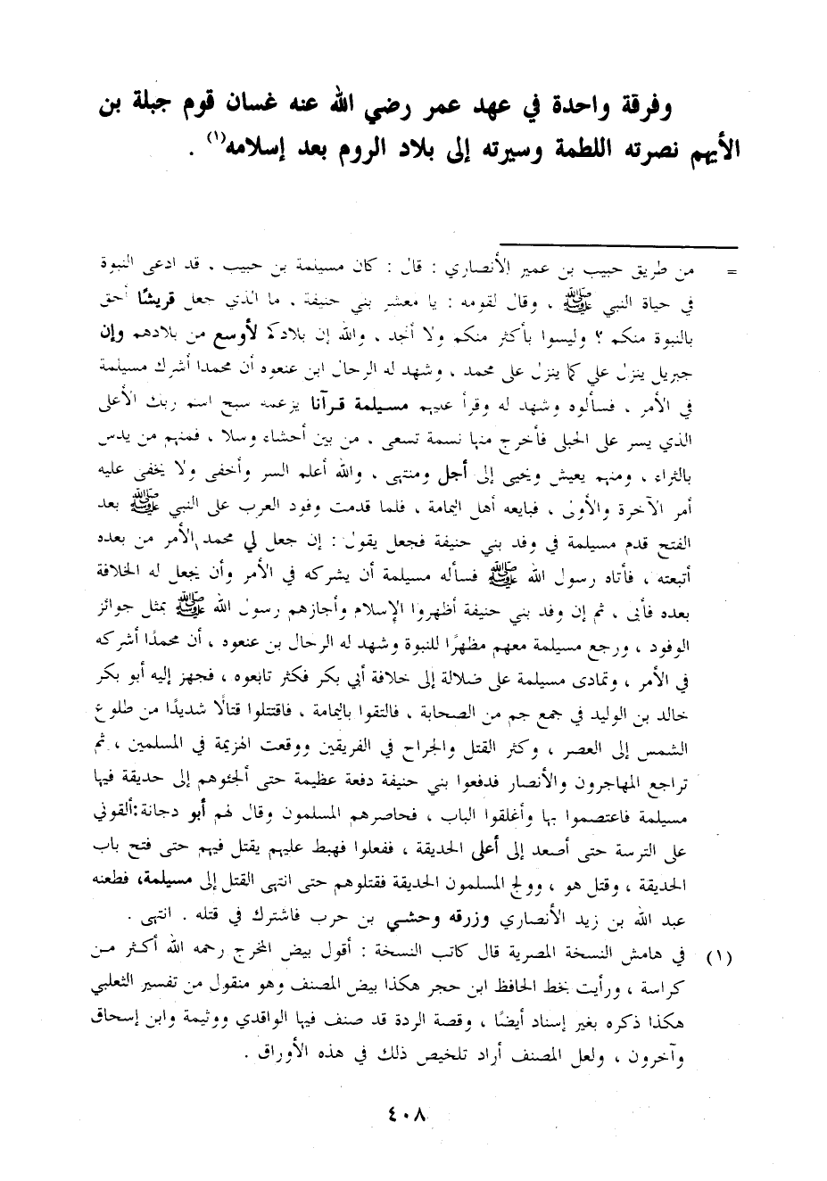 وَفرْقَة وَاحِدَة فِي عهد عمر رَضِيَ اللَّهُ عَنْه غَسَّان قوم جبلة بن الْأَيْهَم نصرته اللَّطْمَة وَسيرَته إِلَى بِلَاد الرّوم بعد إِسْلَامه